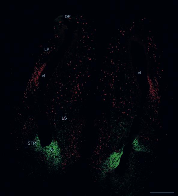 Figure S6 The image represents a frontal section through the entire right and left telecephalic hemispheres of an adult Xenopus brain at the level immediately posterior to the entry of the accessory olfactory bulb. FRMD6-ir is shown in green, HuC in red. A dense FRMD6-ir fiber plexus highlights the striatum and the accumbens nucleus. Additionally, individual fibers can be observed coursing in the lateral septal area and to a lesser extent in the medial pallium. The image was recorded by the NanoZoomer from the company Hamamatsu using the fluorescence option. Abbr.: ventricle (vl), dorsal pallium (DP), lateral pallium (LP), lateral septum (LS), striatum (STR), nucleus accumbens (Nc), Scale bar 500 µm Image published in: Beck J and Kressel M (2020) © The Author(s) 2020. Creative Commons Attribution license