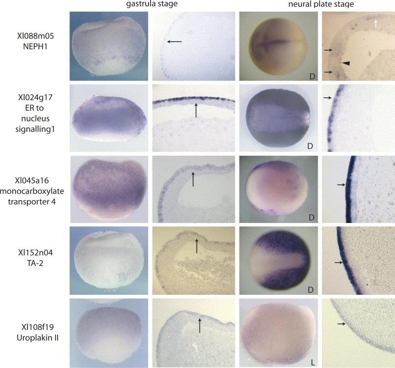 Fig. 2. Genes with superficial expression; Part 2. A wholemount and a section are shown for each gene at gastrula (left-hand panels) and neural plate stage (right-hand panels). The gastrula stage wholemounts have the animal hemisphere to the top. The sections show expression in the animal hemisphere except for NEPH1 which shows the marginal zone as it has stronger expression in the marginal zone. The stage 14 wholemounts are shown as lateral (L) or dorsal views (D) as indicated with anterior to the left. The stage 14 sections are transverse and show expression in the epidermis except for NEPH1 which is sagittal. NEPH1 has a complicated expression pattern which includes the notochord (white arrow), two bands in the anterior neural plate (black arrows) and endoderm (arrow head). Arrows indicate areas of expression. The genes are labelled with the top blast hit and unique EST identifier (e.g., Xl088m05). Image published in: Chalmers AD et al. (2006) Copyright © 2006. Image reproduced with permission of the Publisher, Elsevier B. V.