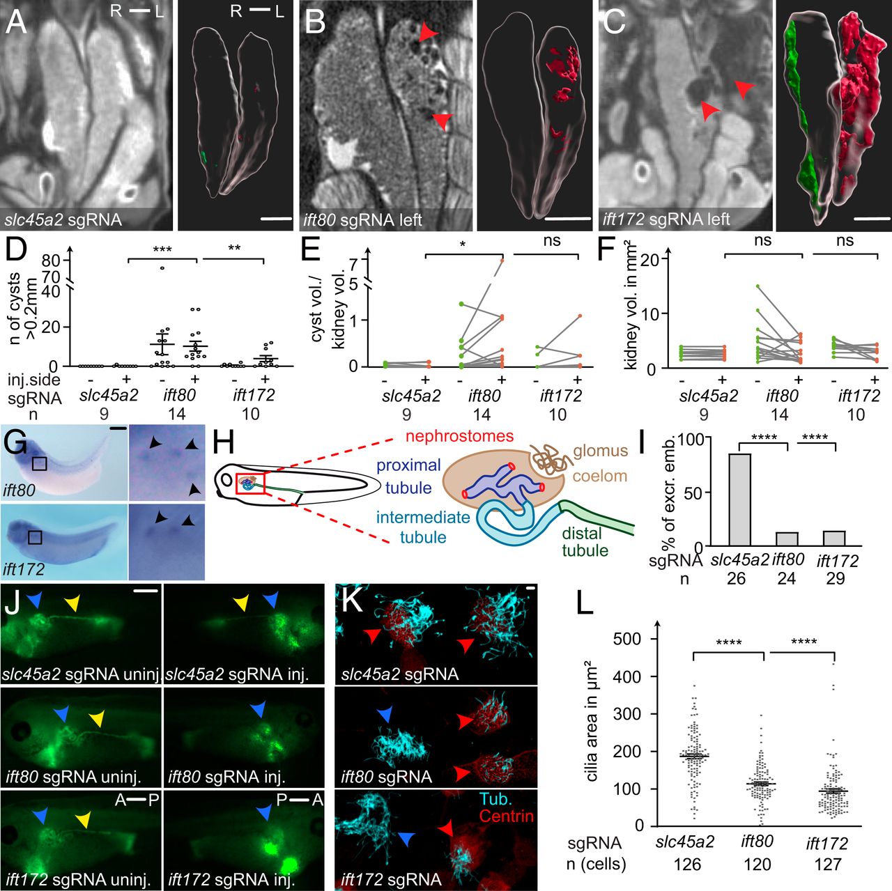 fig. 2. Cystic kidney disease and cilia defects in ift80 and ift172 CRISPRâtargeted X. tropicalis. (AâC) CRISPR/Cas9 targeting of slc45a2, ift80, and ift172 were performed unilaterally in two-cellâstage embryos. Mesonephroi of stage 61 to 63 froglets were analyzed by microCT scans and kidneys and cysts (red arrowheads in B and C) were segmented for 3D volumetric analysis; red: cysts on the injected side; green: uninjected side). (D) The number of cysts (>0.2mm), (E) the ratio of total cyst volume to kidney volume, and (F) the kidney volume (excluding cysts) was calculated and compared with kidneys of control injected animals. (G) Whole-mount in situ hybridization detects ift80 and ift172 in the multiciliated nephrostomes of the pronephros in stage 36 to 38 X. laevis. (H) Schematic depiction of the embryonic renal system of Xenopus. (I and J) Excretion assay with fluorescein-dextran at stage 38 to 40. Blue arrowheads point to the proximal part of the pronephros. Yellow arrowheads indicate fluorescence signal in the distal tubule, lacking on the injected side (J). A: anterior, P: posterior; excr: excreting; and emb: embryos. (K) Confocal images of multiciliated epidermal cells (MCCs) stained against acetylated tubulin (cyan). Centrin-RFP fusion protein served as a lineage marker (red arrowheads) and indicates CRISPR-targeted MCCs. Blue arrowheads point to nontargeted (wild type) cells. (L) The ciliated area was determined for each cell. Error bars indicate SEM. P > 0.05 ns (not significant); *P P P AâC) 1 mm, (G and I) 0.5 mm, and (L) 10 µm.] Image published in: Getwan M et al. (2021) Copyright © 2021 the Author(s). Creative Commons Attribution-NonCommercial-NoDerivatives license