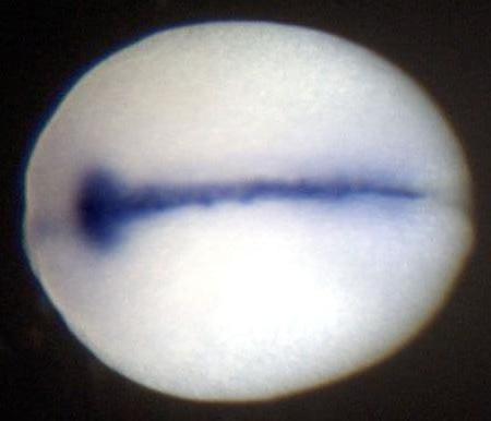 shh (sonic hedgehog) expressed in Xenopus tropicalis embryo via in situ hybridization, stage 20, dorsal view, anterior left.