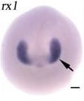 rax ( retina and anterior neural fold homeobox ) gene expression in Xenopus leaves embryo, NF stage 20 embryo, assayed by in situ hybridization, anterior view, dorsal up. Image published in: Zaghloul NA and Moody SA (2007) Copyright © 2007. Image reproduced with permission of the Publisher, Elsevier B. V.