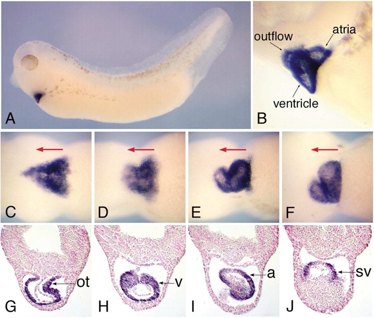 Fig. 1. XMLC2 is expressed throughout the myocardium of developing Xenopus tadpole. (A) The myosin light chain 2a gene is expressed throughout the heart of the Xenopus tadpole (stage 42). At higher magnification (B), expression is evident in both atrial and ventricular chambers as well as the outflow tract. Ventral views of the heart-forming region reveal XMLC2 expression in bilateral patches of cardiac mesoderm (C) prior to heart tube formation (stage 28). Subsequent formation of a contractile myocardial tube (D; stage 32), looping of the heart tube (E; stage 35) and differentiation of distinct atrial and ventricular chambers (F; stage 42) is clearly visible. Red arrows indicate direction of blood flow (posterior to anterior). (G-J) Transverse sections through the looped heart tube (stage 35) show expression in the myocardial walls of the outflow tract (ot), ventricular (v) and atrial (a) regions and the sinus venosus (sv). Image published in: Latinkic BV et al. (2004) Copyright © 2004. Image reproduced with permission of the Publisher and the copyright holder. This is an Open Access article distributed under the terms of the Creative Commons Attribution License.