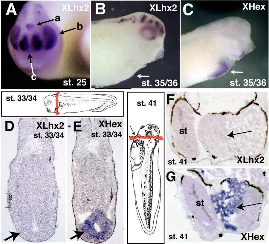 Figure 3. Divergent Lhx2 expression patterns among vertebrates. A: Arrows point to XLhx2 expression in the (a) pineal gland, (b) eyes, and (c) olfactory placodes. B,C: Lateral views of stage 35/36 embryos. XLhx2 expression (B) is undetectable in and around the liver primordium (arrow) in spite of strong expression in the brain and eye. (Although not the focus of this study, readers interested in a comparative analysis of the Xenopus and mouse brain expression patterns of Lhx2 are directed to the work of Bachy et al. ([2001],[2002)] and Moreno et al. ([2004],[2005]). Shown are sections of stage 33/34 (D,E) and stage 41 (F,G) embryos; dorsal is the top. D,F: XLhx2 mRNA is undetected in and around the developing liver. In contrast, intense XHex expression is observed in the stage 33/34 liver diverticulum (E, arrow) and stage 41 liver bud (G, arrow). Images of stage 33/34 and 41 embryos were modified from Nieuwkoop and Faber ([1994]). St, stomach. Image published in: Viczian AS et al. (2006) Copyright © 2006. Image reproduced with permission of the Publisher, John Wiley & Sons.