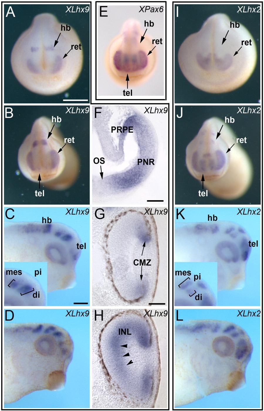 Figure 2. Developmental expression pattern of XLhx9 compared to XPax6 and XLhx2 as determined by whole-mount in situ hybridization. A, B: XLhx9 expression is apparent in the future hindbrain (hb) and retina (ret) at stages 18 (A) and 25 (B). C, D: At stages 30 (C) and 33/34 (D), XLhx9 is expressed in the telencephalon (tel), dorsal diencephalon (di), mesencephalon (mes), and hindbrain. Inset in C: Enlarged view of diencephalon and mesencephalon; relative size of expression domains indicated with brackets. E: XPax6 expression in a stage-25 embryo for comparison to XLhx9. F-H: Vibratome retinal sections after XLhx9 in situ. At stage 25 (F), XLhx9 is expressed throughout the presumptive retinal pigmented epithelium (PRPE) and presumptive neural retina (PNR), but reduced or absent in the optic stalk (OS). By stage 30 (G), XLhx9 expression is confined to the proliferative ciliary margin zone (CMZ) of the retina (arrows). At stage 33/34 (H), XLhx9 is expressed throughout the inner nuclear layer (INL, arrowheads). I-L: In situ hybridizations against XLhx2 on stage matched siblings of embryos in A-D. At stage 18 (I) and 25 (J), XLhx2 is expressed strongly within the eye field, but has reduced or absent expression in the hindbrain as compared to XLhx9. Strong telencephalic expression is also obvious at stage 25 (J). K, L: XLhx2 is expressed within the telencephalon, diencephalon, pineal gland (pi), mesencephalon, and hindbrain at stages 30 (K) and 33/34 (L). Image published in: Atkinson-Leadbeater K et al. (2009) Copyright © 2009. Image reproduced with permission of the Publisher, John Wiley & Sons.