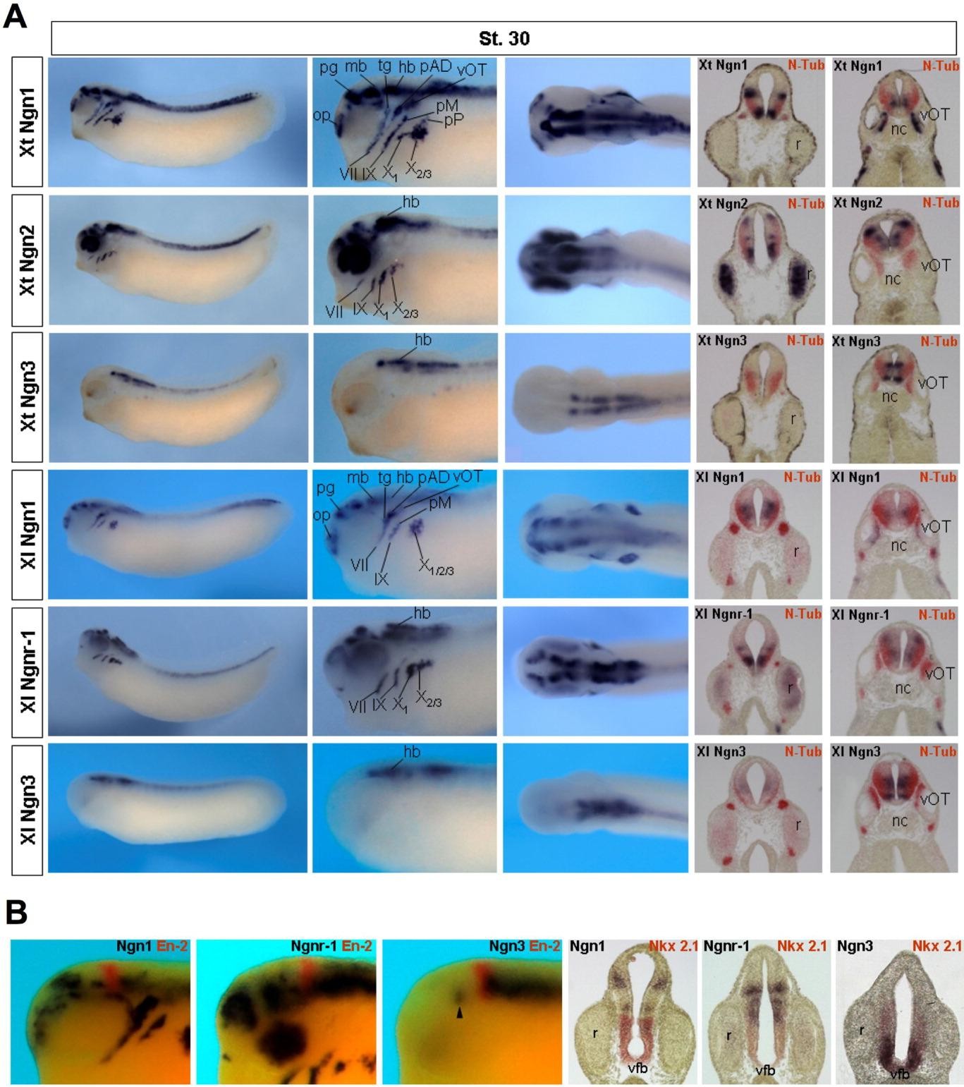 Figure 4. A: Comparative in situ hybridization analysis of X. tropicalis Ngn1, Ngn2, Ngn3, and X. laevis Ngn1, Ngnr-1, and Ngn3 in stage 30 embryos. Probes are indicated on the left of each line of embryos. Shown: first panel, lateral view, anterior to the left; second panel, close-up of the head region; third panel dorsal view of head region; fourth panel, transverse section at the level of the retina; fifth panel, transverse section at the level of the otic vesicle. The transversal sections were performed with embryos stained for both Ngn (dark blue) and N-tubulin (red). VII, facial epibranchial placode; IX, glossopharyngeal epibranchial placode; X1, first vagal epibranchial placode; X2, second vagal epibranchial placode; X3, third vagal epibranchial placode; hb, hindbrain; mb, midbrain; nc, notochord; op, olfactory placode; vOT, otic vesicle; tg, trigeminal placode; pg, pineal gland; pP, posterior lateral line placode; pM, middle lateral line placode; pAD, anterodorsal lateral line placode; r, retina. B: Double in situ hybridization of stage 30 X. laevis embryos with Ngn1, Ngnr-1, Ngn3 (dark blue) and the mid-hindbrain boundary marker En-2 (red) or with the ventral forebrain marker Nkx2.1 (red) (transversal section). Black arrowhead marks the expression of Ngn3 in the ventral forebrain.