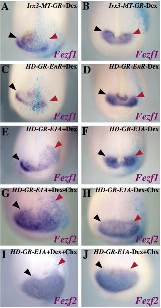 Fig. 6. Irx repress Fezf genes. All embryos are dorsal views at stage 14â15. Black and red arrowheads point at the control or injected side, respectively. (A, B) In embryos injected with Irx3-MT-GR mRNA Fezf1 is downregulated in the presence (A) but not in the absence (B) of Dex. (C, D) Injection of HD-GR-EnR mRNA caused similar Fezf1 downregulation. (E, F) In contrast, injection of HG-GR-E1A mRNA caused posterior Fezf1 expansion in the presence (E) but not in the absence of the hormone (F). (GâJ) Fzf2 is also activated by HG-GR-E1A mRNA even in the presence of cycloheximide. Image published in: Rodríguez-Seguel E et al. (2009) Copyright © 2009. Image reproduced with permission of the Publisher, Elsevier B. V.