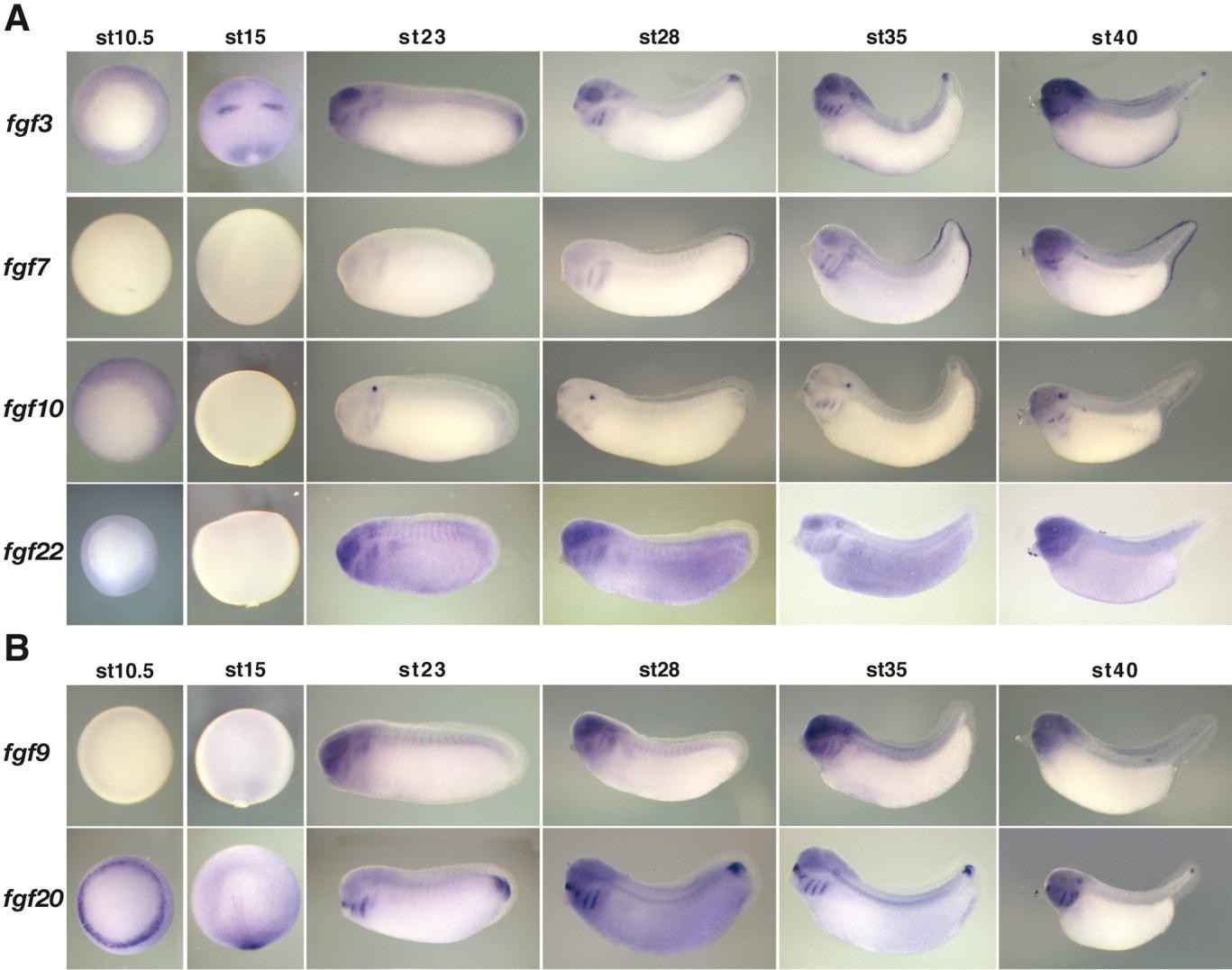 Figure 4. Analysis of the spatial expression patterns of the fgf7 and fgf9 subfamilies. A: Whole mount in situ hybridisations of fgf3, fgf7, fgf10, and fgf22 at the indicated stages. B: Whole mount in situ hybridisations of fgf9 and fgf20 at the indicated stages. For stage 10.5, the images are vegetal views; for stage 15, the images are dorsal views; and for stage 23, 28, 35, and 40, the images are lateral views (anterior is left, posterior is right, dorsal is up, and ventral is down). A schematic representation of a Xenopus embryo at stage 28 with the different embryonic tissues labelled is presented in Supp. Figure S3.