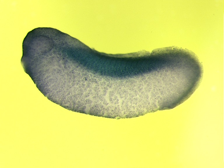 actn3 (actinin alpha 3) gene expression in Xenopus laevis, NF stage 29&30 embryo, in situ hybridization, lateral view, anterior left, dorsal up. Copyright © CNRS UMR 8080, Nicolas Pollet Image published in: AXELDB Database, AxelDB (Image Pages)