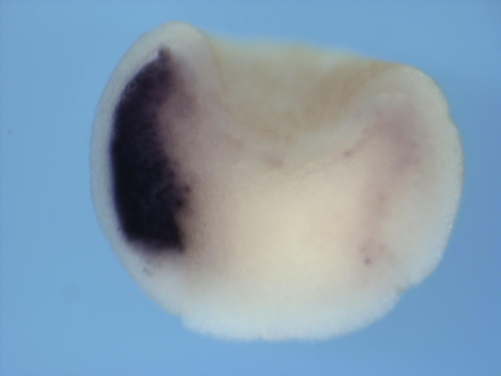 frzb (frizzled related protein ) gene expression in bisected Xenopus laevis embryo, mid-sagittal section, assayed via in situ hybridization, NF stage 10.5, dorsal right, animal hemisphere up. Copyright © Zorn Lab, Aaron M Zorn Image published in: Zorn