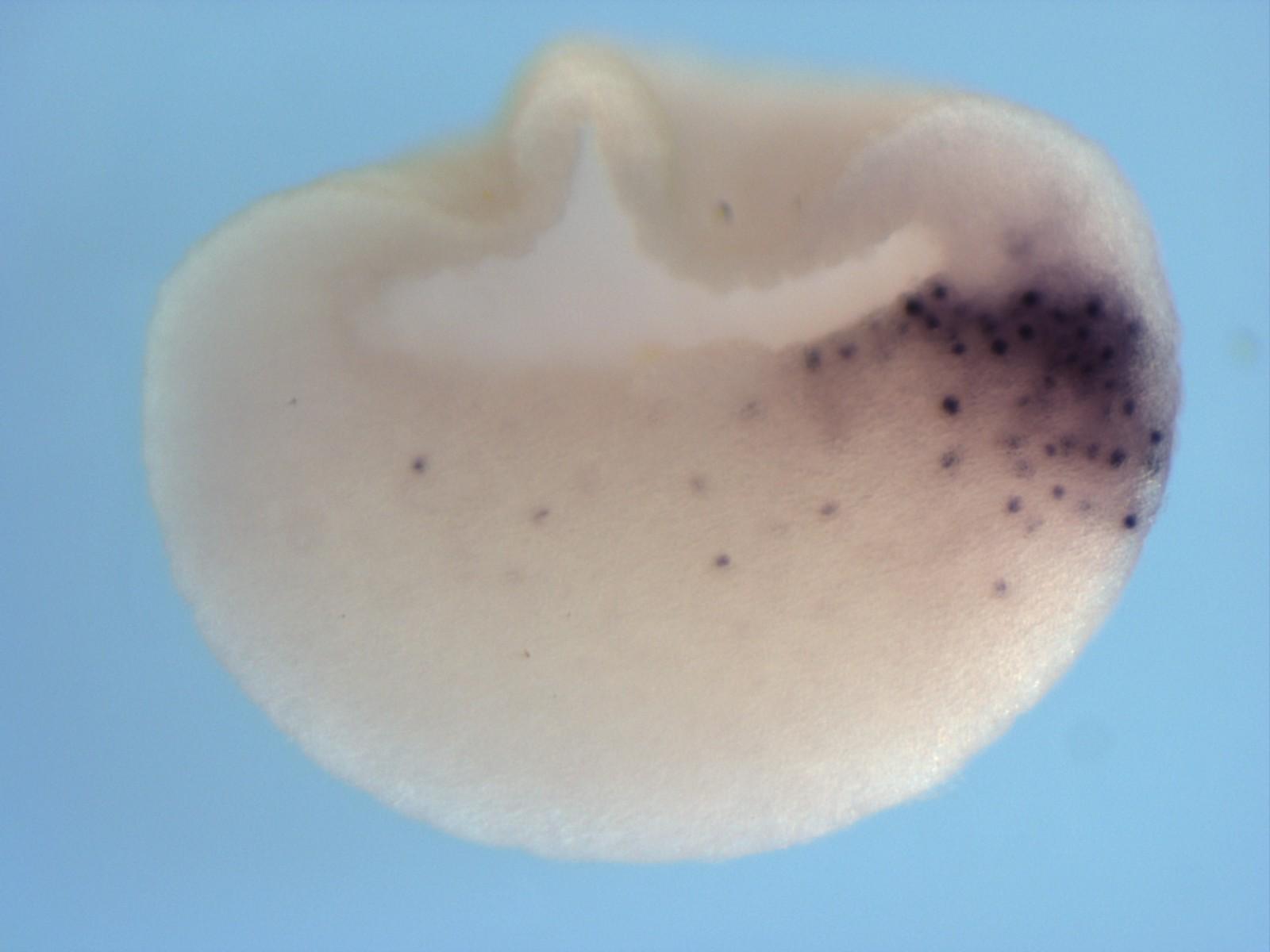 gsc (goosecoid) gene expression in bisected Xenopus laevis embryo, mid-sagittal section, assayed via in situ hybridization, NF stage 9, dorsal right, anterior up. Copyright © Zorn Lab