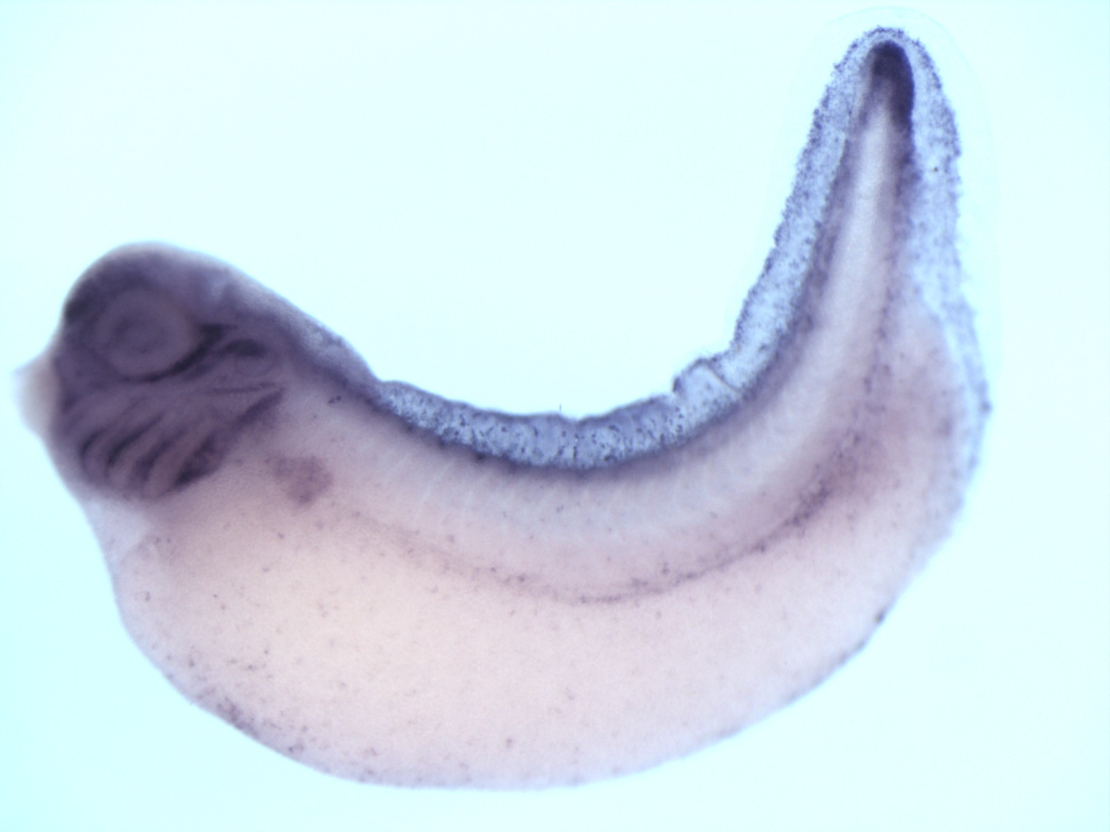 ets2 (v-ets avian erythroblastosis virus E26 oncogene homolog 2) gene expression in Xenopus laevis embryo, assayed via in situ hybridization, NF stage 33 & 34, lateral view, anterior left, dorsal up. Copyright © Zorn Lab, Aaron M Zorn Image published in: Zorn