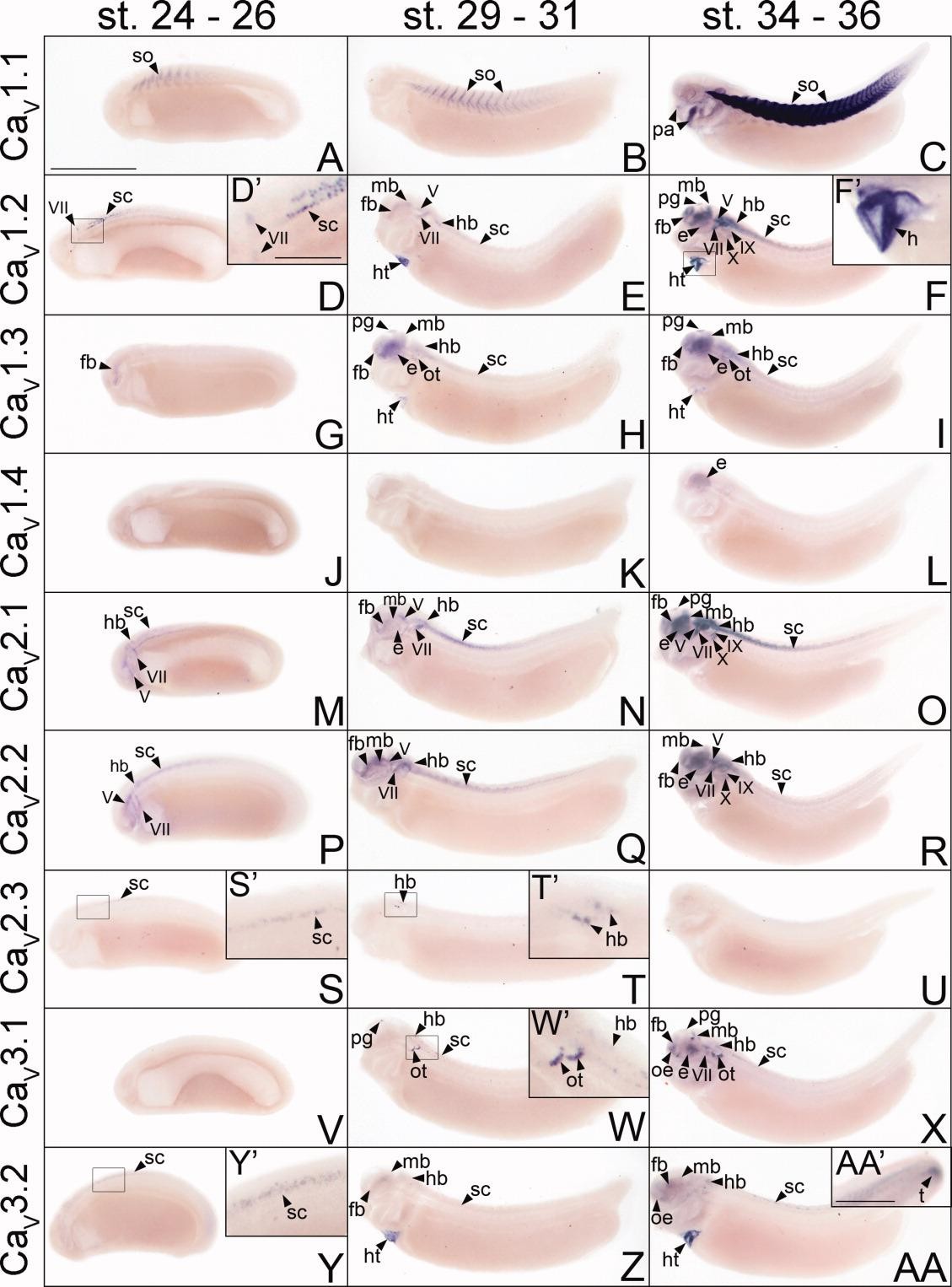 Figure 2. Spatial and temporal expression patterns of VGCC alpha 1 subunits in developing X. laevis embryos using whole-mount in situ hybridization. Embryos were viewed laterally, with anterior to the left and dorsal to the top. A,D,G,J,M,P,S,V,Y: Stages 24-26 (early tail bud). B,E,H,K,N,Q,T,W,Z: Stages 29-31 (late tail bud). C,F,I,L,O,R,U,X,AA: Stages 34-36 (swimming tadpole). A-C: CaV1.1 expression. D-F: CaV1.2 expression. G-I: CaV1.3 expression. J-L: CaV1.4 expression. M-O: CaV2.1 expression. P-R: CaV2.2 expression. S-U: CaV2.3 expression. V-X: CaV3.1 expression. Y-AA: CaV3.2 expression. D prime ,F prime ,S prime ,T prime ,W prime ,Y prime : Magnified images of portions of the embryos indicated by the hollow boxes. AA prime : Magnified image of the tail of an embryo at swimming tadpole stage showing CaV3.2 expression. Arrowheads indicate regions of expression. fb, forebrain; e, eye; hb, hindbrain; ht, heart; mb, midbrain; oe, olfactory epithelium; ot, otic vesicle; pa, pharyngeal arches; pg, pineal gland; sc, spinal cord; so, somite; t, tail bud; V, cranial ganglion V, trigeminal ganglion; VII, cranial ganglion VII, geniculate (facialis) ganglion; IX, cranial ganglion IX, glossopharyngeal ganglion; X, cranial ganglion X, vagal ganglion. Scale bars = 1.0 mm in A-AA, 0.4 mm in AA prime ; 0.2 mm in D prime ,F prime ,S prime ,T prime ,W prime ,Y prime .