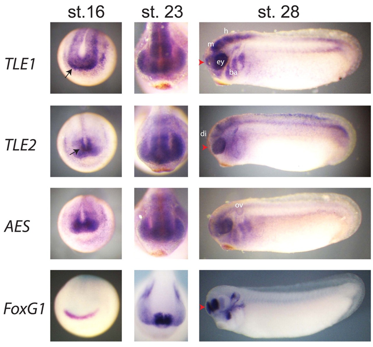 Fig. 3. Expression of X. tropicalis TLEs. Expression patterns of TLE1, TLE2, AES and FoxG1 as shown by whole-mount in situ hybridisation of X. tropicalis embryos at neural plate stage (st. 16; frontal view), early tailbud (st. 22-23; frontal view), and late tailbud (st. 28; lateral view). TLE1 and TLE2 show expression throughout the anterior neural plate (st. 16), but TLE1 is strongest in the anterior neural ridge (black arrow), whereas TLE2 is strongest in a more medial ridge (black arrow). Note the expression of TLE1, but not TLE2, in the forebrain of st. 28 embryos, which largely overlaps with the telencephalic expression of FoxG1 (telencephalon indicated by red arrowheads). Ey, eye; m, midbrain; h, hindbrain; ba, brancial arches; di, diencephalon; ov, otic vesicle.