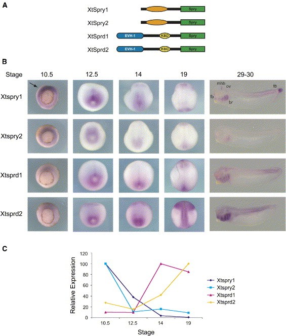 Figure 2. Xtsproutys and Xtspreds Are Expressed in Similar Patterns, but at Slightly Different Times(A) Cartoon depiction of domain structures for each protein. Spry, conserved Sprouty domain; EVH-1, VASP homology domain; KBD, c-Kit binding domain.(B) In situ hybridizations for each gene. At gastrula stages (stage 10.5), Xtsproutys showed more extensive staining around the blastopore than Xtspreds (arrow). Neurula stages showed increased staining of Xtspreds and decreased Xtsproutys. Tail bud stages showed similar staining in branchial arches (br), otic vesicle (ov), and tail bud (tb), but Xtspred staining was absent in mid-brain/hind-brain isthmus (mhb) and forebrain (fb).(C) Quantitative real-time RT-PCR analysis of each geneâs expression over time. Relative expression levels showed Xtsproutys peak before stage 12.5 and then diminish, while Xtspreds levels increased after stage 12.5. Image published in: Sivak JM et al. (2005) Copyright © 2005. Image reproduced with permission of the Publisher, Elsevier B. V.