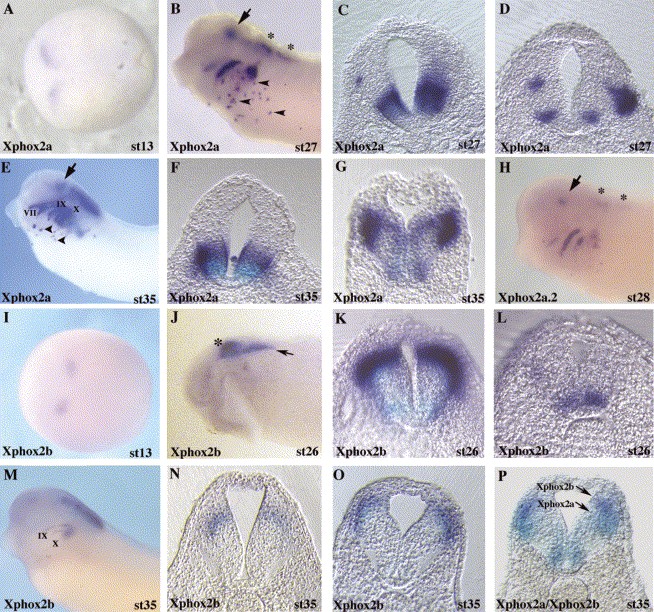 Fig. 2. Characterization of Xphox2a, Xphox2a.2 and Xphox2b expression in the Xenopus embryo. Whole-mount in situ hybridization was used to characterize Xphox2 gene expression during Xenopus development. Xphox2a (AâG) and Xphox2a.2(H) expression in the developing embryo. Similar results were obtained with both full-length and 3â² specific Xphox2a and Xphox2a.2 probes as outlined in the text and Experimental Procedures. Panels (AâG) show staining with full-length Xphox2a probe. Arrow marks ventral midbrain domain of Xphox2a expression at stage 27 (B) and stage 35 (E). This ventral domain is further documented in transverse sections at these stages (C,F). Asterisks mark zones of Xphox2a and Xphox2a.2 expression in the hindbrain (B,H). Transverse sections through posterior hindbrain domains of Xphox2a stained embryos are shown at stage 27 (D) and stage 35 (G). Note that the stage 27 embryo was imbedded asymmetrically and staining in (D) is therefore asymmetric due to the combination of thick sections (30 μm) and discontinuous zones of Xphox2a expression within this region. (IâO) Xphox2b expression in the developing embryo. Asterisk marks anterior hindbrain domain of Xphox2b expression (J) also shown in transverse section at stage 26 (K) and stage 35 (N). Arrow marks posterior hindbrain Xphox2b staining (J) also shown at stage 26 (L) and stage 35 (O). In (P) a cross-section through the hindbrain of an embryo double hybridized with Xphox2a and Xphox2b probes is shown. The Xphox2a domain is blue and the Xphox2b domain is magenta/purple. Image published in: Talikka M et al. (2004) Copyright © 2004. Image reproduced with permission of the Publisher, Elsevier B. V.