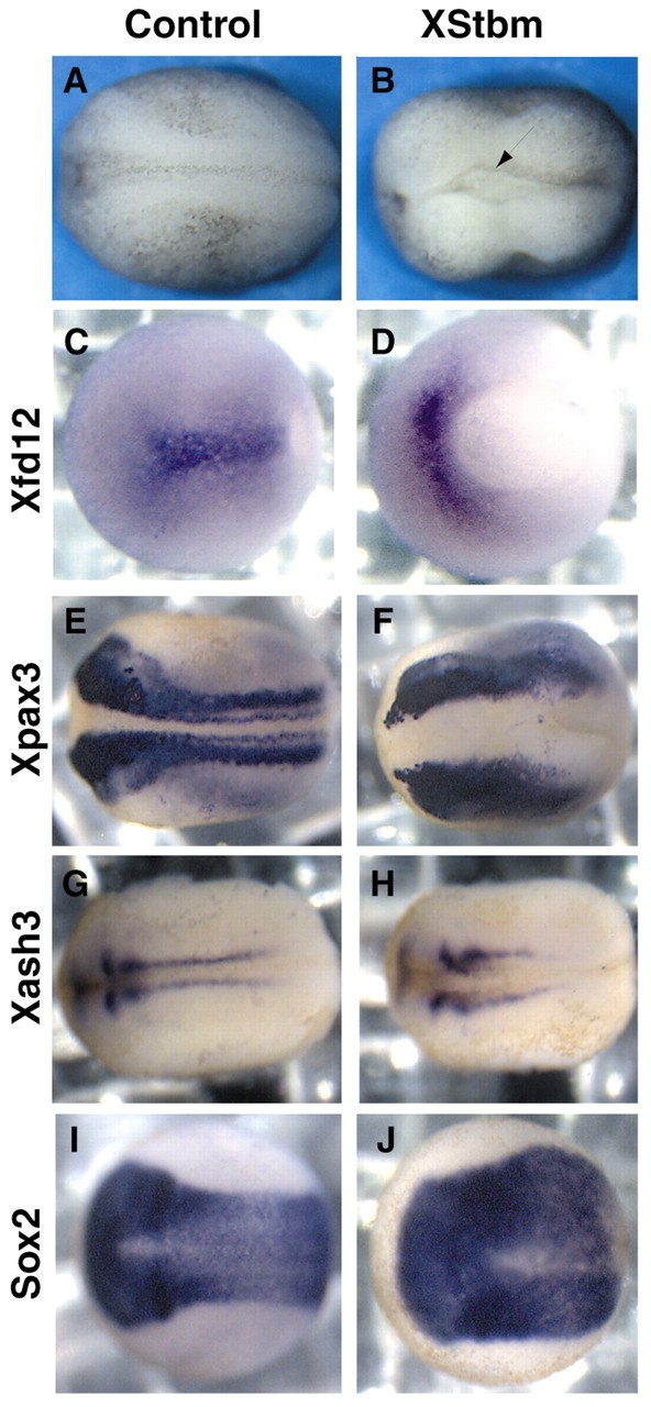 Fig. 9. Expression of wild-type Stbm elicits neural tube closure defects and failure of neural convergent extension. (A) Control embryo at mid-neurulation with closing NT. (B) Stbm-injected embryo with defective NT closure. (C) Xfd12 expression in control embryo at stage 14. (D) Xfd12 expression reveals defective neural convergent extension in a stage 14 Stbm-injected embryo. (E) Expression of Xpax3 in a control embryo. (F) Expression of Xpax3 in an XStbm injected embryo. (G) Expression of Xash3 in a control embryo. (H) Expression of Xash3 in an XStbm-injected embryos. (I) Expression of Sox2 in a control embryo. (J) Expression of Sox2 in an XStbm-injected embryos. Image published in: Wallingford JB and Harland RM (2002) Copyright © 2002. Image reproduced with permission of the Publisher and the copyright holder. This is an Open Access article distributed under the terms of the Creative Commons Attribution License.
