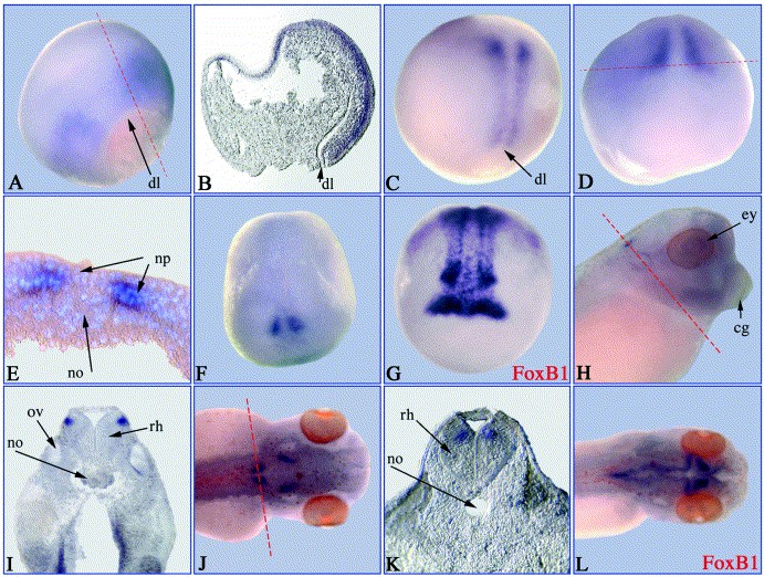 Fig. 3. Spatial expression of xFoxB2. Whole mount in situ hybridisation was performed with xFoxB2 and xFoxB1 (G, L) antisense probes and embryos at different developmental stages. (A) Stage 11; (B) parasagittal section of A; (C) stage 12; (D) stage 14; (E) transversal section of D, nuclei stained with DAPI; (F) stage 15; (G) FoxB1 (Fkh-5), stage 16; (H) stage 35; (I) horizontal section of H; (J) stage 41; (K) horizontal section of J; (L) FoxB1, stage 41. Embryos shown in (AâC) are orientated with dorsal side to the right and animal half to the top; D, F, G anterior view; H shows a lateral and J as well as L a dorsal view. The plane of sections is marked by red lines. cg, cement gland; dl, dorsal lip; ey, eye; np, neural plate; no, notochord; ov, otic vesicle; rh, rhombencephalon. Image published in: Pohl BS et al. (2002) Copyright © 2002. Image reproduced with permission of the Publisher, Elsevier B. V.