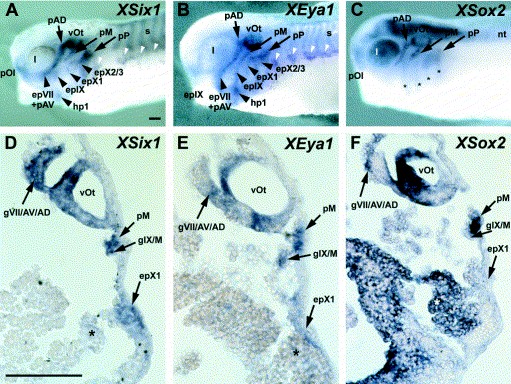 Fig. 4. Expression of XEya1 (B,E) compared to other placodal markers XSix1 (A,D) and XSox2 (C,F) in lateral views (AâC) and transverse sections at the level of the otic vesicle (DâF) of stage 30â34 Xenopus embryos. Patterns of expression of XEya1 (B,E) and XSix1 (A,D) are largely identical in the adenohypophysis (data not shown), olfactory placodes (pOl), the otic vesicle(vOt), lateral line placodes (pAV, pAD, pM, pP), epibranchial (epVII, epIX, epX1, epX2/3) and hypobranchial placodes (hp1). Co-expression of both genes is also observed in cranial ganglia that have a placodally-derived component, e.g. in the profundal/trigeminal ganglionic complex (data not shown), in the fused ganglia of the facial, anteroventral and anterodorsal lateral line nerves (gVII/AV/AD in D,E), and in the fused ganglia of the glossopharyngeal and middle lateral line nerves (gIX/M in D,E). Additionally, XEya1 and XSix1 are co-expressed in the somites (s in A,B), in hypaxial muscle precursors (white arrowheads in A,B) and weakly in the pharyngeal pouches (asterisks in D,E). Placodal expression of XSox2 (C,F) overlaps with the expression of XEya1 and XSix1 in the adenohypophysis (data not shown), the olfactory placode, the otic vesicle and the lateral line placodes, as well as in some cranial ganglia (e.g. gVII/AV/AD in F). In contrast to XEya1 and XSix1, however, XSox2 is not expressed in the profundal/trigeminal placodes or ganglia (data not shown) and in the epibranchial placodes (C), whereas it is strongly expressed in the neural tube (nt), the lens (l), and the pharyngeal pouches (asterisks). Bar in (A): 0.1 mm (AâC). Bar in (D): 0.1 mm (DâF). Image published in: David R et al. (2001) Copyright © 2001. Image reproduced with permission of the Publisher, Elsevier B. V.