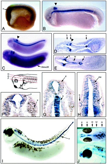 Fig. 2. Xbcan in situ hybridization. The first sign of Xbcan expression was detected during mid-neurula stages (according to Nieuwkoop and Faber (NF), 1967: stage 17) as shown in (A): after in situ hybridization, the specimen was dehydrated and soaked in tetrahydronaphtalin to achieve optical transparency. Expression is restricted to the developing notochord (n). (B) Cleared late neurula stage (NF 25) embryo: beside the notochord, Xbcan transcription takes place in a confined stripe-like pattern in the fifth and sixth rhombomere (marked by an arrow head). (C) Xkrox20 is used as a positional marker for being expressed in the third and fifth hindbrain segment. Xbcan transcription, see arrow head. (D) Slant-frontal histological cross-section through the mid- and hindbrain region of an tailbud stage embryo (NF 32) hybridized both with Xbcan and Xkrox20: expression of both Xbcan and Xkrox20 is detectable within the fifth rhombomere (arrow head); 3., 5.: third and fifth rhombomere, respectively. (E) Slant histological section through the brain region of a late tailbud stage embryo (NF 32): Xbcan expression was observable in a broad area in the hindbrain as well as in the inner epithelial layer of the posterior part of the rhombencephalon extending into the medulla oblongata (m). (FâH) Horizontal histological sections across the head region of a late tailbud stage embryo (NF 35), sectional planes were as indicated as in the inlet on the mid-left side of the panel, anterior to the top; d, diencephalon; e, eye; mc, mesencephalon; p, prosencephalon; o, otic anlage; r, rhombencephalon. (F) Note Xbcan expression is detectable in the inner epithelial layer of the prosencephalon and right below the cephalic flexure in the diencephalon (G) as well as in the notochord. (H) Furthermore, Xbcan expression is also visible in the anterior part of the rhombencephalon. (I) Tadpole stage embryo (NF 40): Xbcan expression is detectable in various brain regions other than the hindbrain. (J) Close-up view at the head region of specimen shown in I in clearing solution (as described in A), upper part: dorsal view, lower part: lateral view; III, third ventricle; IV, fourth ventricle. Image published in: Sander V et al. (2001) Copyright © 2001. Image reproduced with permission of the Publisher, Elsevier B. V.