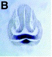 vax1 (ventral anterior homeobox 1) gene expression in Xenopus laevis embryo via in situ hybridization, transverse section through head region, anterior to optic vesicle, NF stage 23, anterior top.