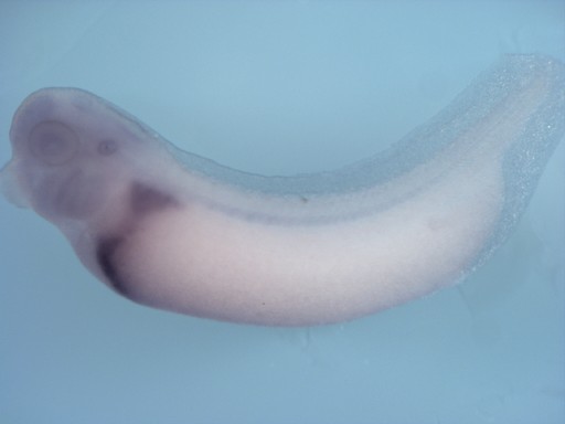 pdx1 (pancreatic and duodenal homeobox 1) expressed in Xenopus laevis embryo via in situ hybridization, stage 34 and 35, lateral view, anterior left.