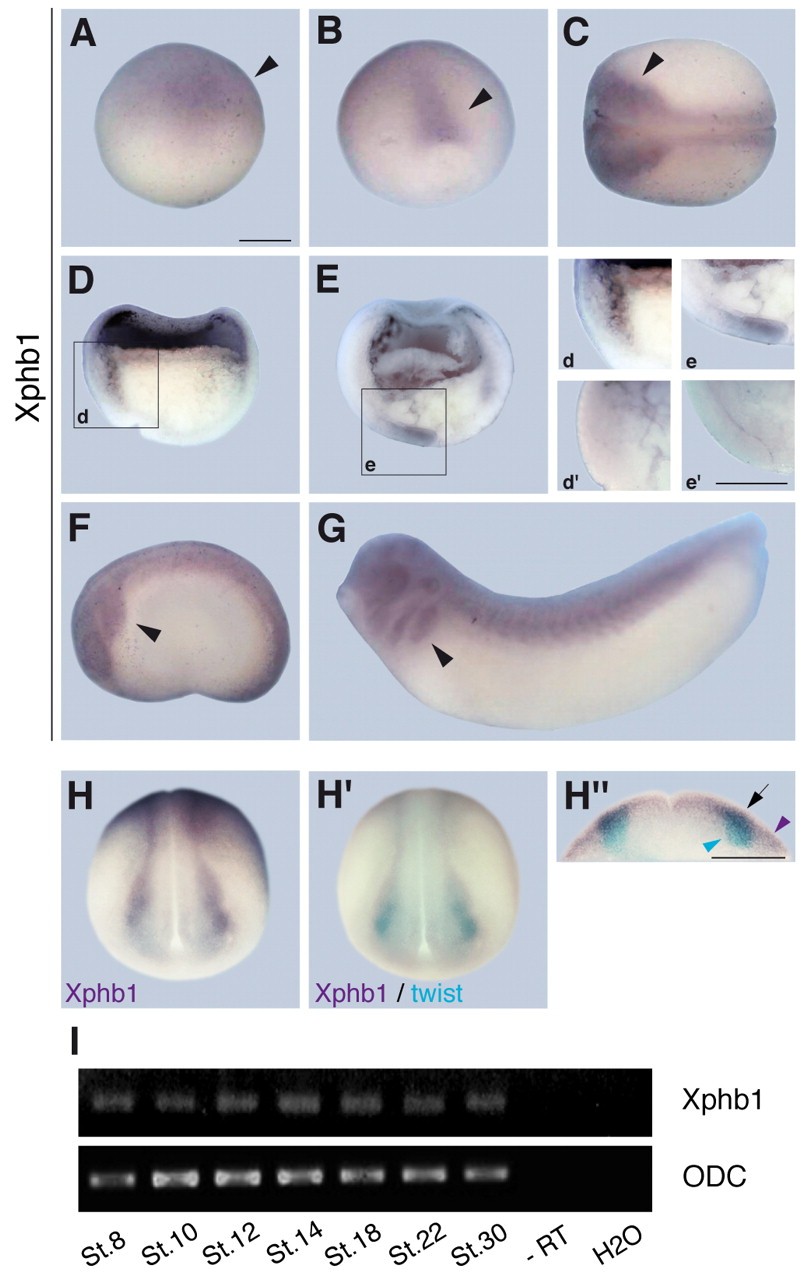 Fig. 1. Xphb1 is expressed in the presumptive cranial neural crest (CNC) region. (A-Hâ²) In situ hybridization (ISH) for Xphb1 (A-H) and Xphb1 plus twist (Hâ²,Hâ²). (A) At blastula (stage 9) Xphb1 is expressed in the dorsal animal ectoderm (arrowheads; animal pole is towards the top). (B) At late gastrula stage (stage 11.5) Xphb1 transcripts are found in the posterior dorsal area (arrowhead). (C) At neurula stage (dorsal view) Xphb1 is detected in migrating neural crest (arrowhead) and in the neural tube. (D,E) Semi-sections of stage 10 (D) and stage 11.5 (E) gastrula stage Xenopus embryos (animal pole towards the top). Insets demonstrate Xphb1 expression in the mesendoderm (d) and in the posterior neuroectoderm including mesoderm (e). No Xphb1 mRNA is detectable in comparable regions of sense control embryos (dâ²,eâ²). (F,G) From neurulation onwards (F, stage 23; G, stage 28; lateral view) Xphb1 expression is restricted to the neural crest territory (arrowheads), the eye and brain. (H-Hâ²) Double ISH at stage 18 shows that Xphb1 (H, purple) is partially co-expressed with twist (blue) in the neural crest (Hâ²). (Hâ²) Transverse section showing the colocalization of Xphb1 and twist (arrow); Xphb1 (purple arrowhead) and twist (blue arrowhead) are also expressed in non-overlapping regions. Scale bars: 400 μm. (I) RT-PCR analysis of Xphb1 expression at the indicated stages. ornithine decarboxylase (ODC) was used as an internal control. Additional controls were performed without reverse transcriptase (âRT) and without cDNA (H2O). Image published in: Schneider M et al. (2010) Copyright © 2010. Image reproduced with permission of the Publisher and the copyright holder. This is an Open Access article distributed under the terms of the Creative Commons Attribution License.