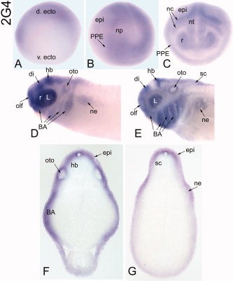 Figure 9. Expression of a CG10576-related gene. A: At late gastrula stages, the ectodermal expression of 2G4 is enhanced on the dorsal side (d. ecto; v. ecto, ventral ectoderm; side view). B: At neural plate stages, 2G4 is expressed diffusely throughout the neural plate, preplacodal ectoderm (PPE), and dorsal epidermis (anterolateral view). C: 2G4 is expressed throughout the neural tube, retina, PPE, cranial neural crest, and epidermis (anterior view). D: At tail bud stages, 2G4 is intensely expressed in the retina, diencephalon (di), hindbrain, placodes (olf, L, oto), branchial arches, and weakly in the nephric mesoderm (side view). E: At larval stages, the neural tube expression expands to the dorsal spinal cord, and nephric mesoderm staining is prominent (side view). F,G: Transverse sections at hindbrain (F) and spinal (G) levels demonstrate neural (hb, sc), branchial arch, otocyst, epidermal and nephric mesoderm expression. Image published in: Neilson KM et al. (2010) Copyright © 2010. Image reproduced with permission of the Publisher, John Wiley & Sons.