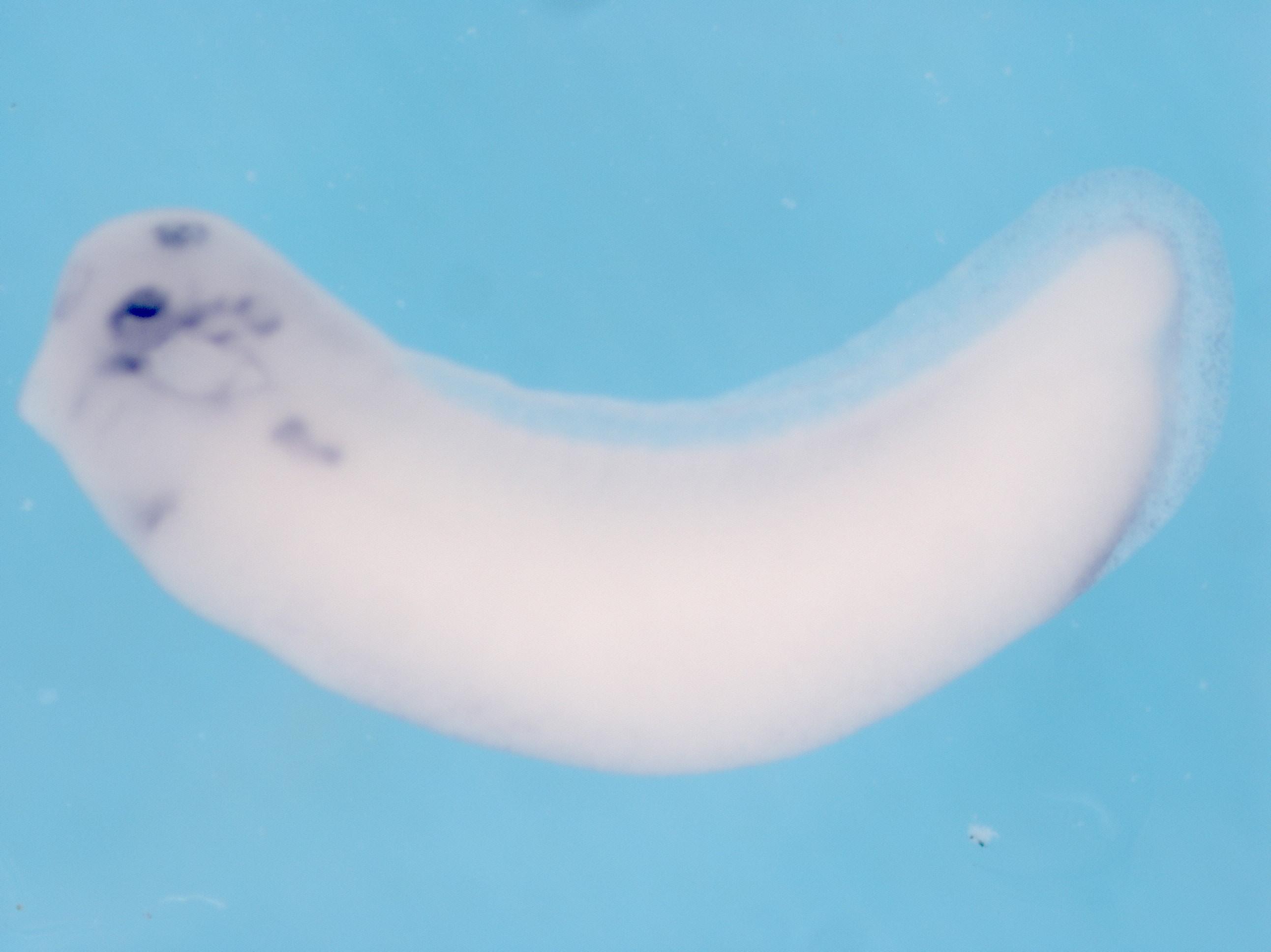 jag1 (jagged 1) gene expression in Xenopus laevis embryo via in situ hybridization, NF stage 29 & 30, lateral view, anterior left, dorsal up. Copyright © European Xenopus Resource Centre (EXRC), Peter G. Coxhead