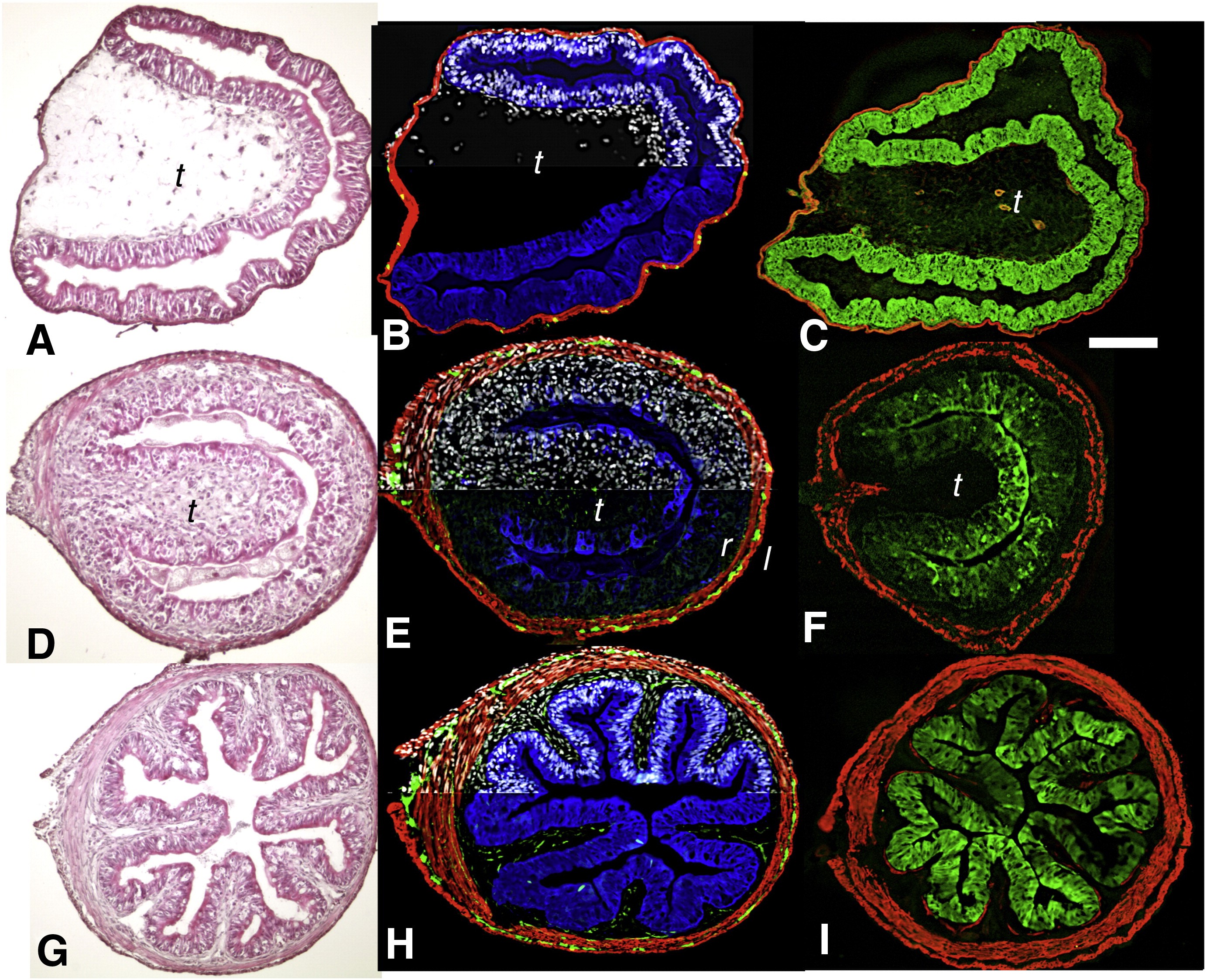 Fig. 1. Virtually every tissue is affected during spontaneous metamorphic remodeling of the duodenum. Cross sections of the duodenum from (AâC) wild-type prometamorphic tadpoles NF57; (DâF), metamorphic climax NF61; (GâI), and the end of metamorphosis NF66. (C, F, and I) Cross sections of the duodenum from tadpoles transgenic for IFABP-GFP. The GFP antibody reaction is green; smooth muscle actin antibody is red. (A, D, and G) Hematoxylin and eosin. (B, E and H) Immunoreactivity against endogenous intestinal fatty acid binding protein (IFABP; blue), muscle-specific smooth muscle actin (red), enteric neuron-specific neural beta-tubulin (green); and a nuclear counter-stain (dapi; white) is shown for half of each section. t = typhlosole, c = circular muscle, l = longitudinal muscle. Scale bar in C denotes 0.2 mm length. Image published in: Schreiber AM et al. (2009) Copyright © 2009. Image reproduced with permission of the Publisher, Elsevier B. V.