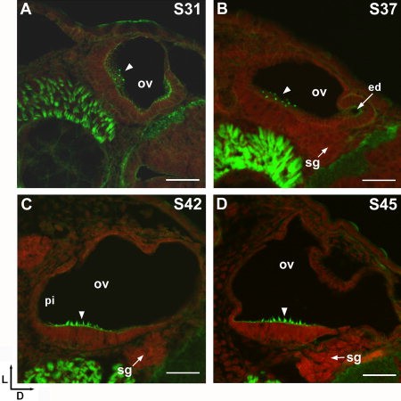 Figure 3. The F-actin cytoskeleton (green) of stereociliary bundles is detected with Alexa 488–phalloidin fluorescence in the Xenopus laevis otic vesicle. A–D: Arrows point to stereociliary bundles in confocal images of cryosections from stages 31 (A), 37 (B), 42 (C), and 45 (D). Propidium iodide counterstain (red) labels RNA (cytosol) and DNA (nuclei). Scale bar = 50 μm.Download figure to PowerPoint Image published in: Quick QA and Serrano EE (2005) Copyright © 2005. Image reproduced with permission of the Publisher, John Wiley & Sons.