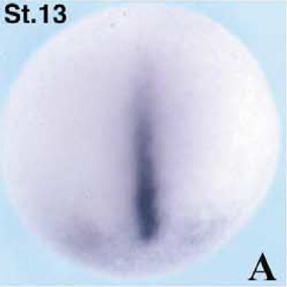 Dag1 expression in st 13 embryos. Dorsal view, Anterior is down.