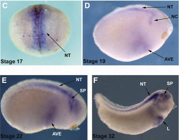 Fig. 1. Genomic structure and temporal expression of X. tropicalis HNF6. (C,D,E,F), In situ hybridisation of whole X. tropicalis embryos, with (C) showing view from dorsal aspect and (D,E,F) from the lateral aspect. Key: AVE, anterior ventral endoderm; L, liver; NC, neural crest; NT, neural tube; SP, sensory placodes. Image published in: Haworth KE and Latinkic B (2009) Copyright © 2009. Image reproduced with permission of the Publisher, University of the Basque Country Press.