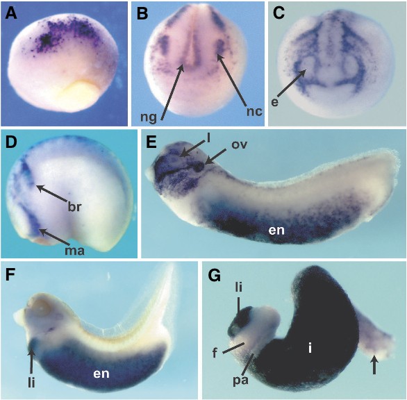 Fig. 7. Developmental expression of C9 from gastrula to organ bud stage. Anterior is to the left and dorsal to the top unless otherwise indicated. (A) Dorsal view of stage 10 embryo showing early spotted expression dorsal ectoderm. Anterior is to the top. (B) Anterior view of stage 17 embryo showing discrete neural crest (nc) and neural groove expression (ng). (C) Anterior view of stage 19-20 embryo. The three segments of the anterior neural crest show discrete expression at this stage. Mandibular segment ex- pression surrounds the presumptive eye field (e). (D) Lateral view of stage 22 embryo shows expression in mandibular (ma) and branchial segments (br) of anterior migrating neural crest. There is discrete hyoid expression noticeable between those two seg- ments. (E) Stage 27 embryo. Neural crest expression is seen in all three segments, as well as in the otic vesicle (ov), the lens (l), and the endoderm (en). (F) Stage 35 embryo shows strong liver and endodermal expression. (G) Isolated gut tube shows liver (li) and intestinal expression sparing the foregut (f), but no distal intestinal (proctodeum) expression (arrow); (lu) lung, (pa) pancreatic bud. Image published in: McLin VA et al. (2008) Copyright © 2008. Image reproduced with permission of the Publisher, University of the Basque Country Press.