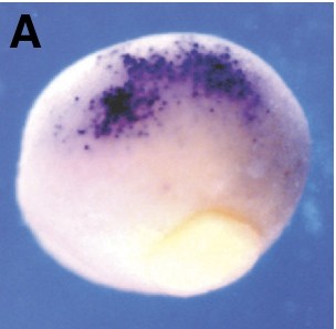 c9 (complement component 9) gene expression in Xenopus laevis embryo via in situ hybridization, NF stage 10, anterio-dorsal view, dorsal up. This image is extracted from figure published in: McLin VA et al. (2008), Image published in: McLin VA et al. (2008) Copyright © 2008. Image reproduced with permission of the Publisher, University of the Basque Country Press.