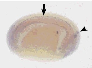 thbs1 (thrombospondin 1) gene expression in Xenopus laevis embryos, NF stage 19, as assayed by in situ hybridization, lateral view, anterior left, dorsal up. This image is extracted from figure published in: Urry LA et al. (1998), Image published in: Urry LA et al. (1998) Copyright © 1998. Image reproduced with permission of the Publisher, John Wiley & Sons.
