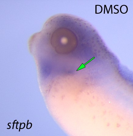 sftpb (surfactant, pulmonary-associated protein B ) gene expression in Xenopus laevis embryo, via in situ hybridization, NF stage 29 & 30, lateral view, anterior left, dorsal up. This image is extracted from figure published in: Wang JH et al. (2011), Image published in: Wang JH et al. (2011) Copyright ©2011 Wang et al; licensee BioMed Central Ltd. Creative Commons Attribution license