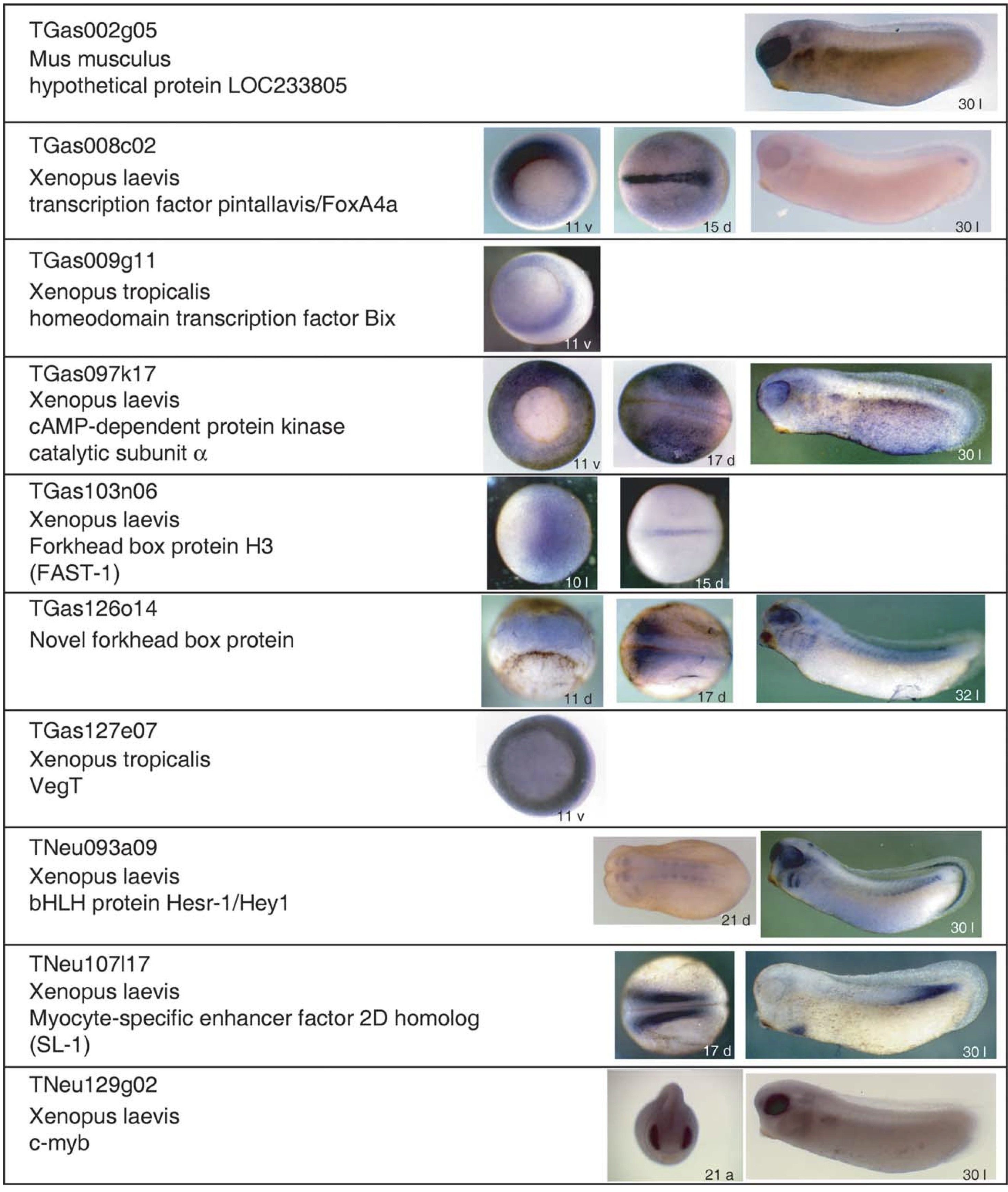 Fig. 6. Regionalized expression pattern of clones giving rise to gastrulation defects with effects on the expression of the early mesoderm markers. Ten clones from this synphenotype group gave rise to restricted expression patterns. The images are ordered by clone name. For each clone the species and annotation of the closest matching blastx hit is shown. Abbreviations are: a, anterior view (stage 21); d, dorsal view (stage 11, 13, 15, 17 and 21); l, lateral view (stage 10, 30, and 32); v, vegetal view (stage 11). Image published in: Chen JA et al. (2005) Copyright © 2005. Image reproduced with permission of the Publisher, Elsevier B. V.Gene Synonyms Species Stage(s) Tissue foxh1 fast-1, fast1, foxh1a, LOC108719776, XFast-1, xfast1, xfoxh1 X. tropicalis Throughout NF stage 10 mesoderm dorsal foxa4 fkh1, foxa4-a, FoxA4a, foxa4-b, pintallavis, XFD-1, xfkh1, XFKHI, xkfh-1 X. tropicalis Throughout NF stage 11 marginal zone bix1 bix1.1, bix3, tBix X. tropicalis Throughout NF stage 11 marginal zone prkaca X. tropicalis Throughout NF stage 11 marginal zone foxi2 foxi2-a, foxi2-b X. tropicalis Throughout NF stage 11 dorsal vegt antipodean, brat, tVegT, vegt-a, vegt-b, xombi X. tropicalis Throughout NF stage 11 marginal zone foxa4 fkh1, foxa4-a, FoxA4a, foxa4-b, pintallavis, XFD-1, xfkh1, XFKHI, xkfh-1 X. tropicalis Throughout NF stage 15 notochord foxh1 fast-1, fast1, foxh1a, LOC108719776, XFast-1, xfast1, xfoxh1 X. tropicalis Throughout NF stage 15 notochord prkaca X. tropicalis Throughout NF stage 17 lateral plate mesoderm trunk region foxi2 foxi2-a, foxi2-b X. tropicalis Throughout NF stage 17 neural plate neural plate border optic field pre-chordal neural plate mef2d mef2d-a, mef2d-b, sl1, XMEF2D X. tropicalis Throughout NF stage 17 presomitic mesoderm mef2d mef2d-a, mef2d-b, sl1, XMEF2D X. tropicalis Throughout NF stage 17 presomitic mesoderm hey1 bc8, chf2, herp2, hesr1, hrt-1, hrt1, oaf1, XHRT1 X. tropicalis Throughout NF stage 21 presomitic mesoderm presumptive midbrain-hindbrain boundary pre-chordal neural plate myb c-myb, cmyb, xmyb X. tropicalis Throughout NF stage 21 eye optic vesicle dcun1d3 44m2.4 X. tropicalis Throughout NF stage 29 and 30 eye pronephric kidney anterior branchial crest posterior branchial crest otic vesicle pronephric mesenchyme foxa4 fkh1, foxa4-a, FoxA4a, foxa4-b, pintallavis, XFD-1, xfkh1, XFKHI, xkfh-1 X. tropicalis Throughout NF stage 29 and 30 tail bud chordoneural hinge prkaca X. tropicalis Throughout NF stage 29 and 30 pronephric kidney periocular region pronephric mesenchyme trunk region hey1 bc8, chf2, herp2, hesr1, hrt-1, hrt1, oaf1, XHRT1 X. tropicalis Throughout NF stage 29 and 30 pharyngeal arch branchial arch somite presomitic mesoderm eye forebrain rhombomere tail fin tail bud chordoneural hinge myoblast mef2d mef2d-a, mef2d-b, sl1, XMEF2D X. tropicalis Throughout NF stage 29 and 30 presomitic mesoderm heart myocardium myb c-myb, cmyb, xmyb X. tropicalis Throughout NF stage 29 and 30 pronephric kidney otic vesicle lateral plate mesoderm eye pronephric nephrostome posterior branchial crest foxi2 foxi2-a, foxi2-b X. tropicalis Throughout NF stage 32 otic vesicle lens placode floor plate spinal cord brain visceral pouch diencephalon