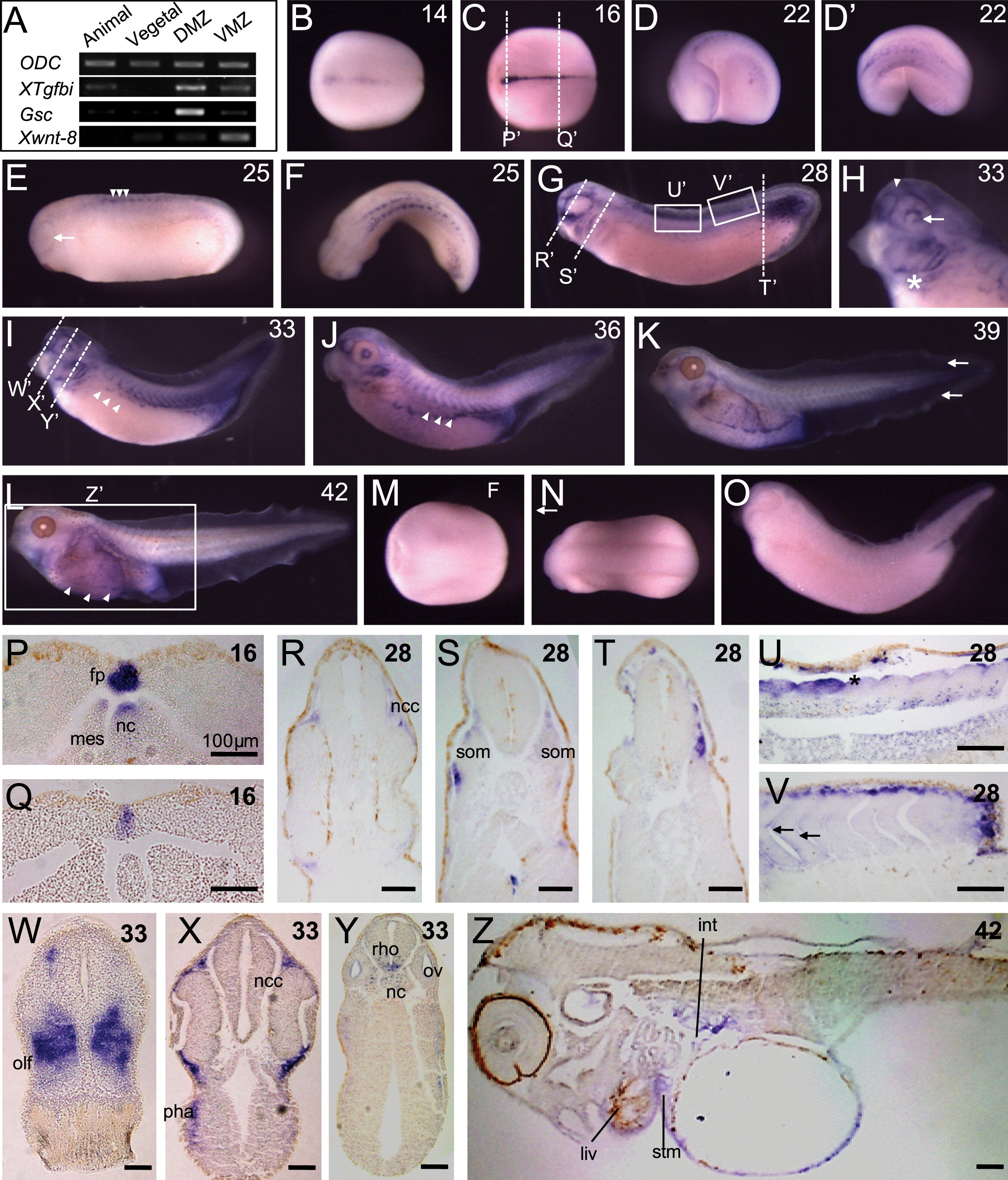 Fig. 2. Expression pattern of XTgfbi. (A) RT-PCR shows, in stage 10 embryos, XTgfbi was strongly expressed in DMZ and weakly expressed in VMZ and animal cap. Gsc and Xwnt-8 are markers for DMZ and VMZ, respectively. (B) Whole mount in situ hybridization of XTgfbi. Dashed lines indicate the position of transversal sections as labelled. (B) Dorsal view (rostral to the left) at stage 14. XTgfbi was weakly expressed in the dorsal midline. (C) Dorsal view at stage 16 showing a decreasing XTgfbi expression gradient in the dorsal midline. (D, D') Lateral and dorsal views at stage 22: XTgfbi expression was seen in the dorsal tips of developing somites. (E, F) Lateral and dorsal views at stage 25: XTgfbi was expressed in dorsal somite tips (arrowheads), weakly in tissues surrounding the eye (arrow). (G) Lateral view at stage 28: XTgfbi was expressed in intersomitic boundaries, around the eye, migrating cranial neural crests and tailbud. (H) Lateral view of embryo head at stage 33: XTgfbi expression was prominent in CNS (arrowhead), eye (arrow) and pitpharyngeal pouches (asterisk). (I) Side view at stage 33 showing strong expression in the somites, tailbud and migrating hypaxial muscle anlagen (arrowheads). (J) Lateral view at stage-36: XTgfbi expression is prominent in the migrating hypaxial muscle (arrowheads), eye and tail fin. (K) Lateral view at stage 39: XTgfbi is detected in migrating hypaxial muscle and tail fin (arrows). (L) Lateral view at stage 42: XTgfbi is expressed in ventral side of the embryo and migrating hypaxial muscle (arrowheads). (M, N, O) In situ hybridization with sense XTgfbi probe shows no specific staining. (P, Q) Transversal sections from C: XTgfbi was strongly expressed in the floor plateand notochord. (R, S, T) Transversal sections from G: XTgfbi was expressed in neural crest cells and somites. (U, V) Parasagittal sections from G: XTgfbi expression is in the somites, strong in the dorsal tips (asterisk) and intersomitic boundaries (arrowheads). (W) Transversal sections from I: XTgfbi expression is in olfactory pits, periphery of prosencephalon, migrating neural crests, pharyngeal pouches as well as rhombencephalon, otic vesicles and notochord. (Z) Sagittal section from L showing XTgfbi expression in tissues surrounding various internal organs and abdominal epithelia. fp, floor plate; int, intestine; liv, liver; mes, mesenchyme; nc, notochord; ncc, neural crest cell; olf, olfactory pit; ov, otic vesicle; pha, pharygneal pouch; rho, rhombencephalon; som, somite; stm, stomach. Scale bar=100 m. Image published in: Wang F et al. (2013) Copyright © 2013. Image reproduced with permission of the Publisher, Elsevier B. V.