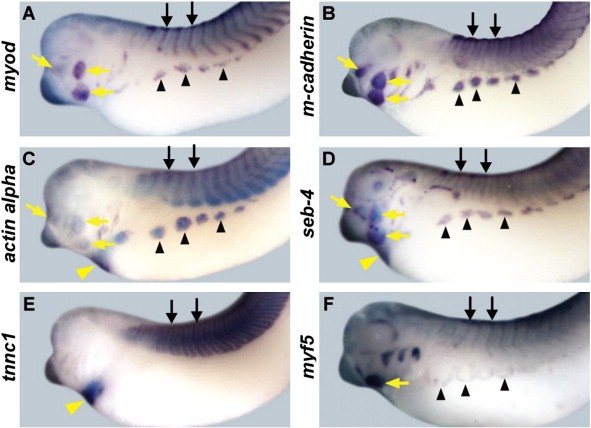 Fig. 4. Expression patterns of muscle target genes In stage 35–37 embryos myod, m-cadherin, actin alpha, seb-4, tnnc1 and myf5 are all expressed in skeletal muscle including somites (black arrows), migrating hypaxial muscle anlagen (black arrowheads) and jaw muscle (yellow arrows). myod, m-cadherin, actin alpha, seb-4, and myf5 (A-D and F) are expressed in the somites, migrating hypaxial muscle anlagen and jaw muscle, and these expression patterns overlap with those of ebf2 and ebf3 (Figure 2). m-cadherin (B) is weakly expressed in a central band in somites, with expression throughout the somite. myf5 (F) expression in somites is weaker than other genes at this stage, and is expressed at the leading edge of migrating hypaxial muscle. tnnc1 (E) is expressed in the somites. actin alpha, seb-4, and tnnc1 are expressed in the heart (yellow arrowheads). All embryos show lateral views.