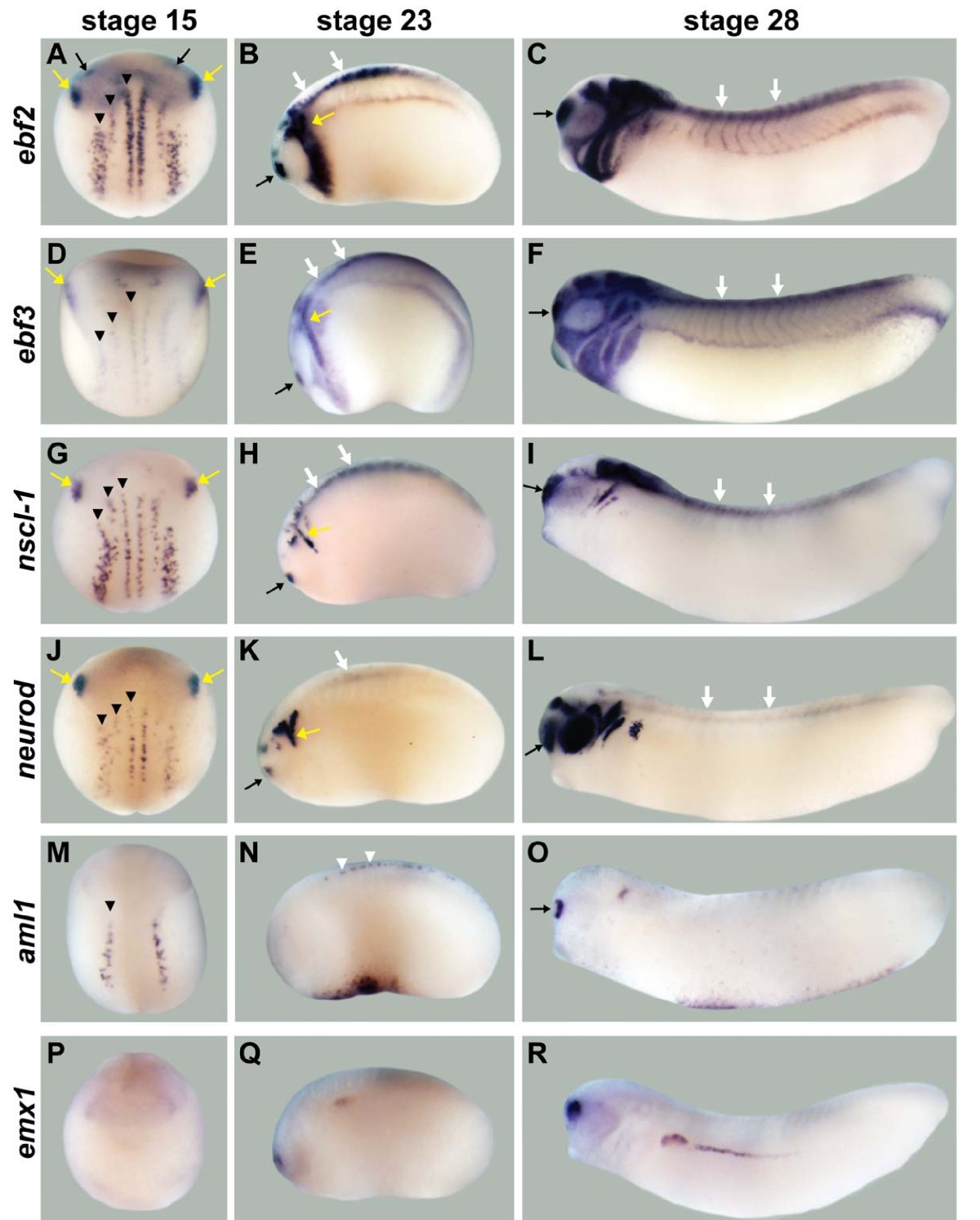 Figure 4. Neuronal expression for ebf genes and transcription factor candidate target genes. (A-F) ebf2 (A-C) and ebf3 (D-F) are expressed in multiple regions of the developing nervous system, including the trigeminal placodes (yellow arrows), olfactory placodes (black arrows), some domains in the brain, the spinal cord (white arrows), and neural crest derivatives like the branchial arches. (G-L) nscl-1 (G-I) and neurod (J-L) are expressed in the trigeminal placodes and three stripes of primary neurons in the neural plate (black arrowheads) at stage 15, and are strongly expressed in the trigeminal placodes, olfactory placodes, and spinal cord at stage 23. At stage 28, nscl-1 is expressed in the olfactory placodes, some domains in the midbrain/hindbrain, spinal cord and cranial ganglia IX and X. At stage 28, neurod is expressed in the olfactory placodes, retina, otic placodes, cranial ganglia, spinal cord and some domains in the brain. (M-O) aml1 is expressed in the lateral primary neuron stripe at stage 15, sensory neurons of the spinal cord (white arrowheads) at stage 23, and the olfactory placodes and otic placodes at stage 28. (P-R) emx1 is weakly expressed in the prospective forebrain region at stage 15. At stages 23 and 28, this gene is expressed in the dorsal forebrain region. Stage 15 embryos show dorsal views except (P) (anterior view). Stage 23 and 28 embryos show lateral views.