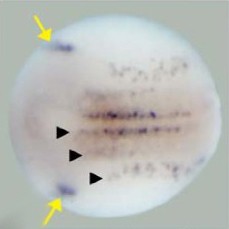 prph (peripherin) gene expression in Xenopus laevis embryos, NF stage 15, as assayed by in situ hybridization. Dorsal view, anterior left. This image is extracted from figure published in: Green YS and Vetter ML (2011), Image published in: Green YS and Vetter ML (2011) Copyright ©2011 Green and Vetter; licensee BioMed Central Ltd. Creative Commons Attribution license