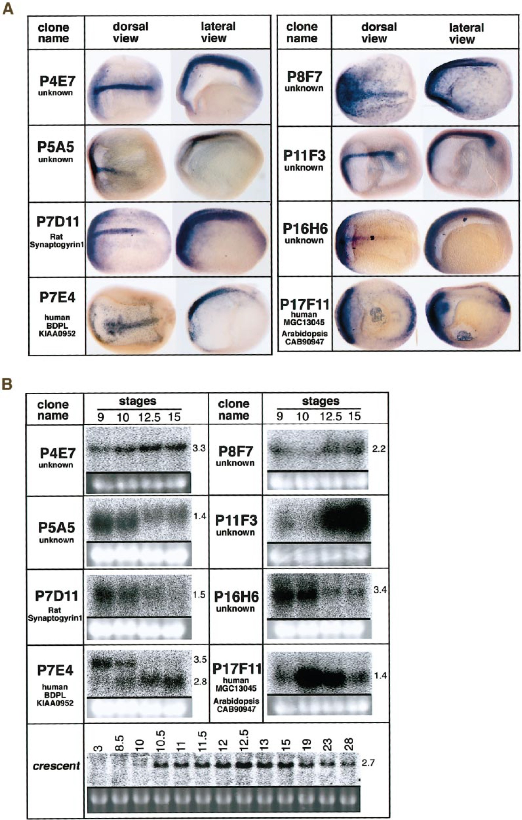 FIG. 3. Isolated cDNA clones expressed in the AEM region and notochord. (A) Clone names and similar genes or proteins in the public databases are indicated on the left side of each panel. Results of whole-mount in situ hybridization for early neurula (stage 13) are shown in dorsal (left) and lateral (right) view. (B) Northern blot analysis. Clone names and their closest genes or proteins in the public databases are indicated on the left side of each panel and the deduced mRNA size (kb) of each clone on the right (see Table 2 for P11F3). The developmental stages are indicated on the top of each column by numerical figures according to Nieuwkoop and Faber (1967). 18S rRNA stained with ethidium bromide is for loading control. Ten micrograms of total RNA from stage-9, -10, -12.5, and -15 embryos were electrophoresed in each lane, blotted, and hybridized with probes derived from each clone except for crescent. Crescent probe was hybridized to the same blot as previously used (Hikasa and Taira, 2001) with a wider range of stages as indicated. Image published in: Shibata M et al. (2001) Copyright © 2001. Image reproduced with permission of the Publisher, Elsevier B. V.