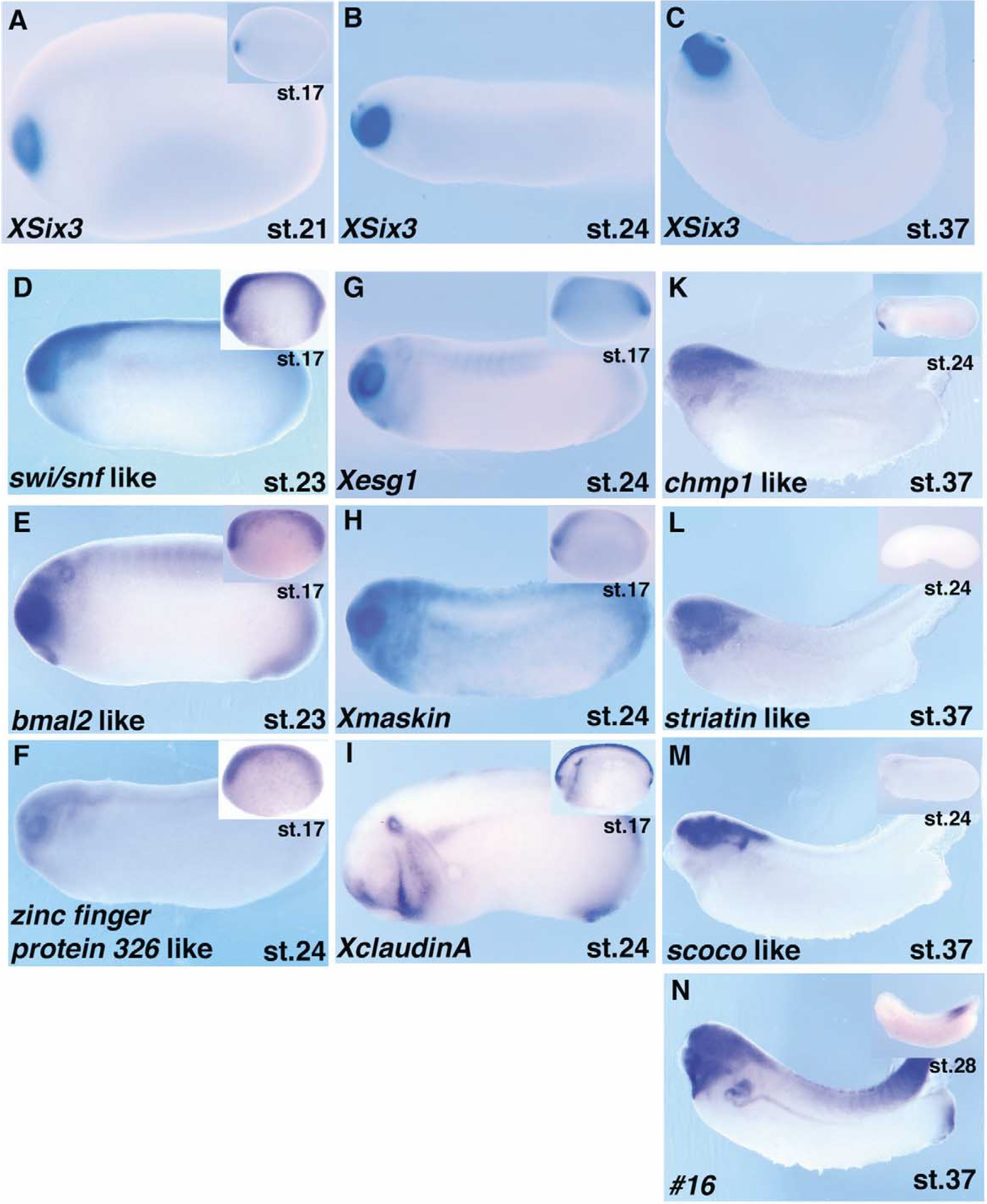 | six3.L | hpe2, six3-a, six3-b, XSix3, xsix3.1, xsix3.2 | X. laevis | Throughout NF stage 17 to NF stage 21 | forebrain eye primordium optic field optic vesicle