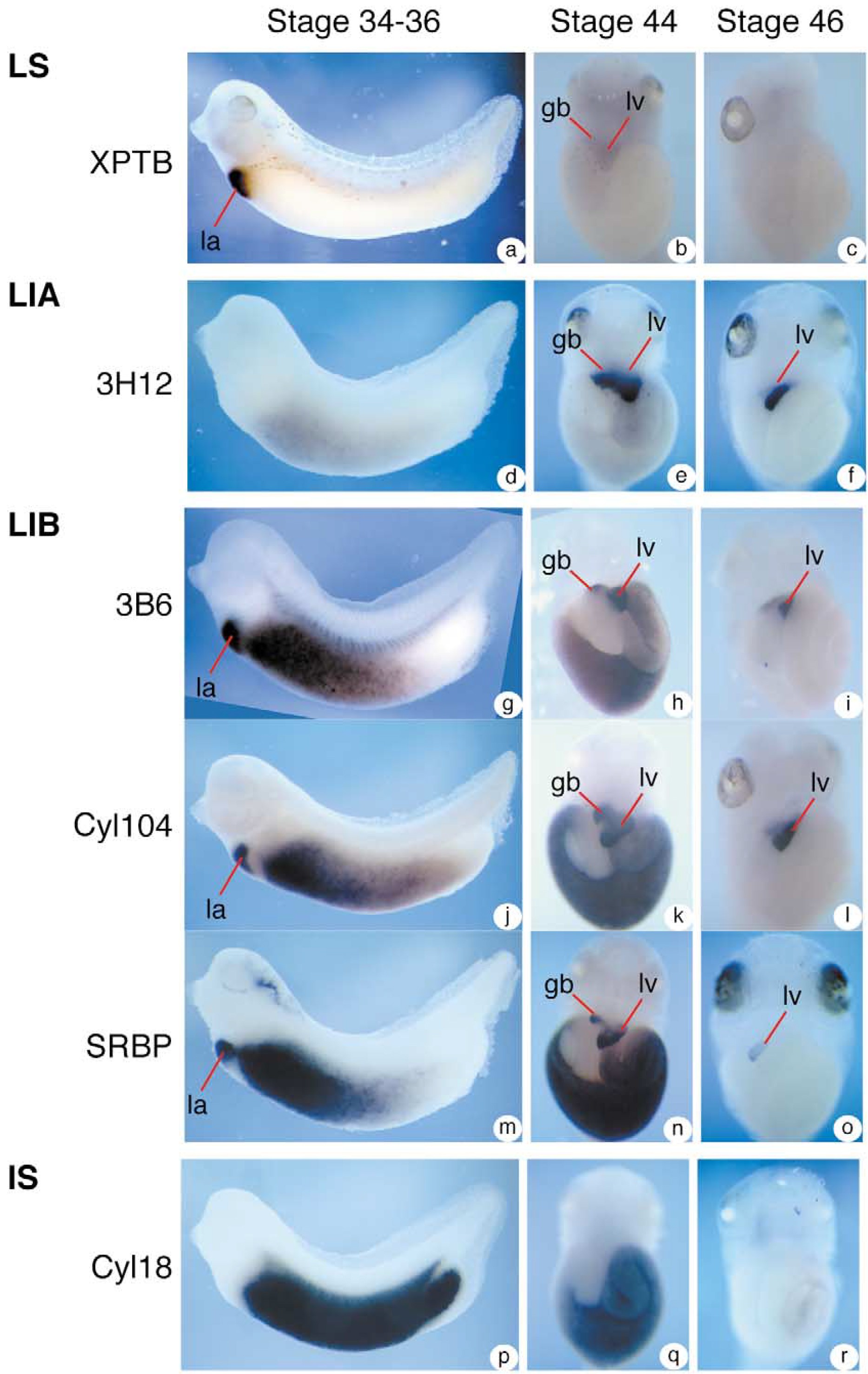 Three embryonic stages were chosen to illustrate the spatial and temporal expression characteristics of liver and intestine marker genes. Genes expressed in the liver diverticulum region are clearly detected at stage 34. Stage 44 is the best developmental stage to simultaneously reveal expression in the gall bladder, liver, pancreas, duodenum and intestine in a ventral view of the embryo. Stage 46 is chosen to show that many genes, which are earlier expressed in both liver and intestine, are now restricted to the embryonic liver. (a) XPTB expression (the LS group): Specific expression in liver diverticulum is observed in stage 34