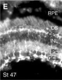 pxn (paxillin) gene expression in sectioned Xenopus laevis eyes, NF stage 47, as assayed by in situ hybridization. Superficial up.