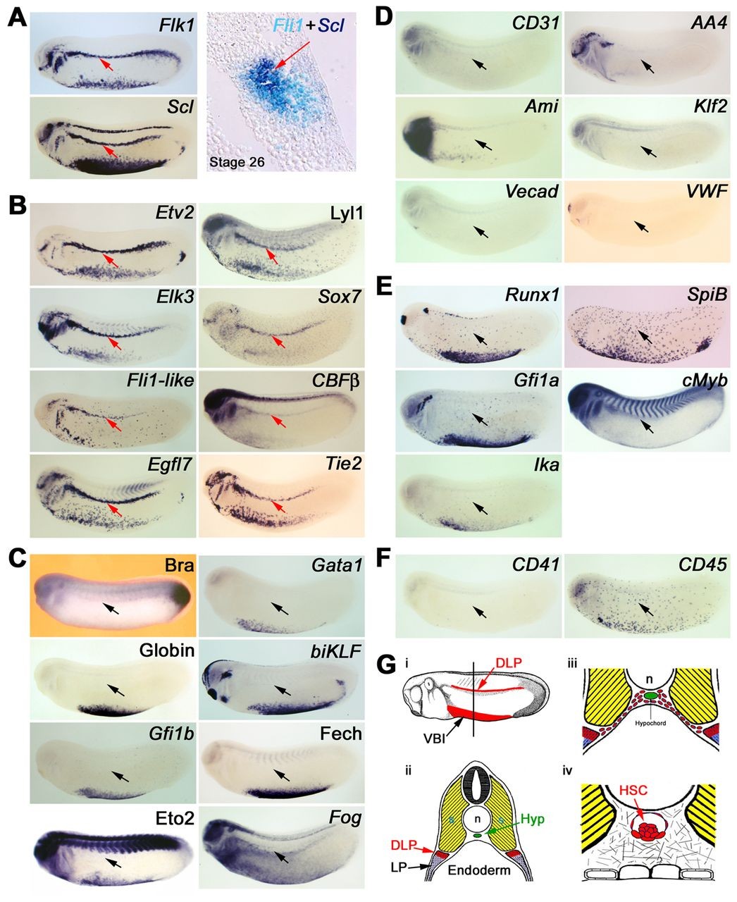 Fig. 1. Characterisation of DLP mesoderm adult haemangioblasts. (A) Adult haemangioblasts localise in the DLP adjacent to the somites and are the earliest HSC progenitors detectable by co-expression of VEGFR2, Flk1, and the stem cell leukaemia gene (Scl), which marks the emergence of haemangioblasts. The panel on the right shows co-expression of the endothelial gene, Fli1, and Scl on a 10 μM section. Note that no morphological differences are observed between adult haemangioblasts and surrounding tissues. (B) Expression analysis revealing novel haematopoietic, Lyl1, Sox7 and CBFβ, as well as novel endothelial, Etv2, Elk3, Fli1-like, Egfl7 and Tie2, gene expression in adult haemangioblasts. (C) Adult haemangioblasts do not express the early mesodermal marker, Brachyury (Bra), nor the erythrocyte differentiation genes, Gata1, Globin, biKLF, Gfi1b, Ferrochelatase (Fech), Eto2 and Fog. (D) Adult haemangioblasts do not express genes associated with mature blood vessels, CD31, AA4, Ami, Klf2, Vecad and VWF. (E) Adult haemangioblasts do not express key HSC-associated genes such as Runx1, SpiB, Gfi1a, cMyb and Ikaros (Ika). (F) Expression of CD41, a gene associated with haematopoietic commitment, and CD45, which is associated with haematopoietic differentiation, are undetectable in adult haemangioblasts. The DLP is indicated by the red or black arrows. All embryos were hybridised as whole mounts and are shown in lateral view, with anterior to the left and dorsal to the top. All embryos are shown at stage 26. (G) Schematic representation of the location of the DLP adult haemangioblast population and its derivatives. (i) Representation of a stage 26 embryo showing in red the Scl expression domains, the ventral blood island and the DLP mesoderm. (ii) Cross section of a stage 26 embryo, at the level indicated by the line in panel i, showing the location of the DLP. Note that adult haemangioblasts (red tissue) lies immediately ventral to the somites (yellow tissue) but at some distance from the hypochord (green tissue), where the DA and HSCs eventually emerge. (iii) Picture showing DA/HSC progenitors migrating from the DLP to the hypochord, a process taking place from stage 28 to 31. (iv) Schematic representation of HSCs emerging in association with the ventral wall of the DA; these haematopoietic clusters are found from stage 42 to 44, 4 days after the specification of adult haemangioblasts in the DLP. Hyp, hypochord; n, notochord; s, somites; VBI, ventral blood island. Image published in: Ciau-Uitz A et al. (2013) Copyright © 2013. Image reproduced with permission of the Publisher and the copyright holder. This is an Open Access article distributed under the terms of the Creative Commons Attribution License.