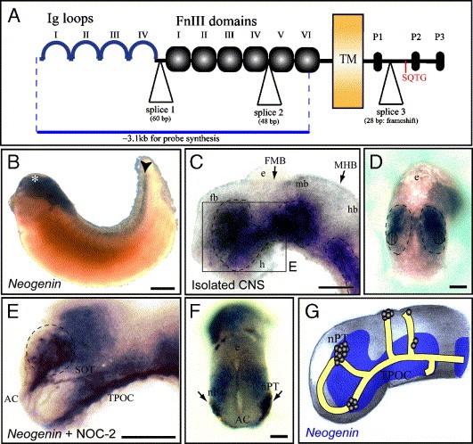 Fig. 2. Neogenin mRNA is expressed in the developing Xenopus forebrain. (A) The predicted structure of Xenopus Neogenin is shown schematically. Xenopus Neogenin contains an open reading frame of 4326 bp and encodes a protein of 1442 amino acids. It has four immunoglobulin-like (Ig) domains, six fibronectin type III (FnIII) domains, a transmembrane region (TM) and a cytoplasmic tail containing three highly conserved domains (P1�P3). The positions of three alternatively spliced exons are indicated (splice 1, bp 1273�1332; splice 2, bp 2534�2581; splice 3, bp 3653�3680). The inclusion of splice 3 (28 bp) imparts a frameshift and premature stop codon, resulting in a truncated protein. Xenopus Neogenin possesses an SQTG amino acid motif in its cytoplasmic tail, instead of the usual conserved C(C/T)TD motif for caspase-3 cleavage, suggesting that Neogenin is unlikely to be involved in caspase-3-mediated cell death in Xenopus. The region used for synthesis of antisense probe is identified. (B) Lateral view of Neogenin mRNA expression on a whole-mount stage 30�31 Xenopus embryo, dorsal to the top and rostral to the left. Neogenin expression is predominant in the head (asterisk) and spinal cord (arrowhead) and is also present in the gut and somites. (C) Lateral view of Neogenin mRNA expression in isolated CNS tissue from a stage 30�31 Xenopus embryo. The forebrain (fb), midbrain (mb), hindbrain (hb), forebrain�midbrain boundary (FMB) and midbrain�hindbrain boundary (MHB) are indicated. Neogenin expression (indicated by the dashed line) is strong in the dorsal forebrain and extends into the ventral midbrain. Expression is also strong in the ventral hindbrain. Neogenin is absent from the hypothalamus (h), epiphysis (e), dorsal midbrain, midbrain�hindbrain boundary and dorsal hindbrain. (D) Dorsorostral view of an isolated stage 30�31 Xenopus brain, dorsal to the top (indicated by the epiphysis (e)), showing strong expression of Neogenin extending from both sides of the midline to the lateral margins of the dorsal forebrain. The estimated position of the nPT relative to these zones of Neogenin expression is indicated (hatched circles), based on double-labeling experiments (see panel F). (E�F) Isolated CNS from stage 30�31 Xenopus embryos, double-labeled for Neogenin mRNA expression (blue) and the NOC-2+ subpopulation of forebrain axons (brown), revealing their spatial relationship. (E) Magnification of a region of the forebrain in lateral view, equivalent to that indicated by a box in panel C, double-labeled for Neogenin (blue) and NOC-2 (brown stain, which appears deep purple in this double label). Neogenin is expressed in the nucleus of the presumptive telencephalon (nPT, indicated by the dashed circle) and in the neuroepithelium underlying the supraoptic tract (SOT) and the longitudinally oriented tract of the post-optic commissure (TPOC). The anterior commissure (AC) is indicated. (F) Dorsorostral view of a double-labeled brain, showing that Neogenin is expressed by the nPT (arrows). The AC is indicated at the rostral margin of the forebrain, and the epiphysis (e) is indicated at the dorsal surface of the brain. (G) Schematic representation of Neogenin mRNA expression in relation to the axon scaffold in the Xenopus forebrain. Scale bar in panel B = 500 μm, panels C�F = 60 μm. Image published in: Wilson NH and Key B (2006) Copyright © 2006. Image reproduced with permission of the Publisher, Elsevier B. V.