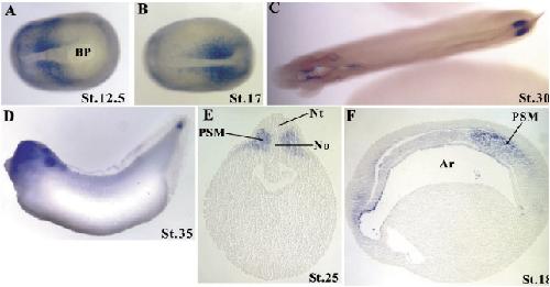 Fig. 3. Spatial expression pattern of Xtbx6r revealed by in situ hybridization. (A-C) Dorsal view. (D) Lateral view. (A-D) Anterior is to the left. (E) Transverse sections, dorsal is to the top. (F) Parasagittal sections, anterior is to the left. Ar, archenteron; Bc, blastocoel; Bp, blastopore; No, notochord; Nt, neural tube; PSM, presomitic mesoderm Image published in: Yabe S et al. (2006) Copyright © 2006. Image reproduced with permission of the Publisher.