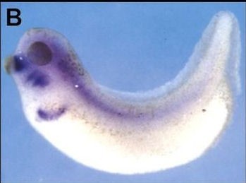 nkx3-2 (NK3 homeobox 2) gene expression in Xenopus laevis embryo via in situ hybridization, NF stage 35 & 36, lateral view, anterior left, dorsal up Image published in: Tseng HT et al. (2004) Copyright © 2004. Image reproduced with permission of the Publisher and the copyright holder. This is an Open Access article distributed under the terms of the Creative Commons Attribution License.