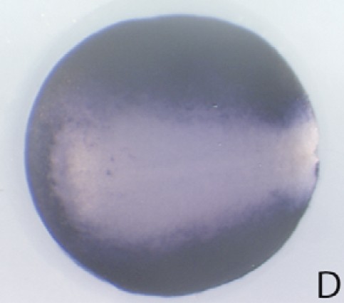 krt70 (keratin 70) gene expression in a Xenopus laevis embryo, NF stage 14, as assayed by in situ hybridization. Dorsal view: anterior left. This image is extracted from figure published in: Chalmers AD et al. (2006), Image published in: Chalmers AD et al. (2006) Copyright © 2006. Image reproduced with permission of the Publisher, Elsevier B. V.